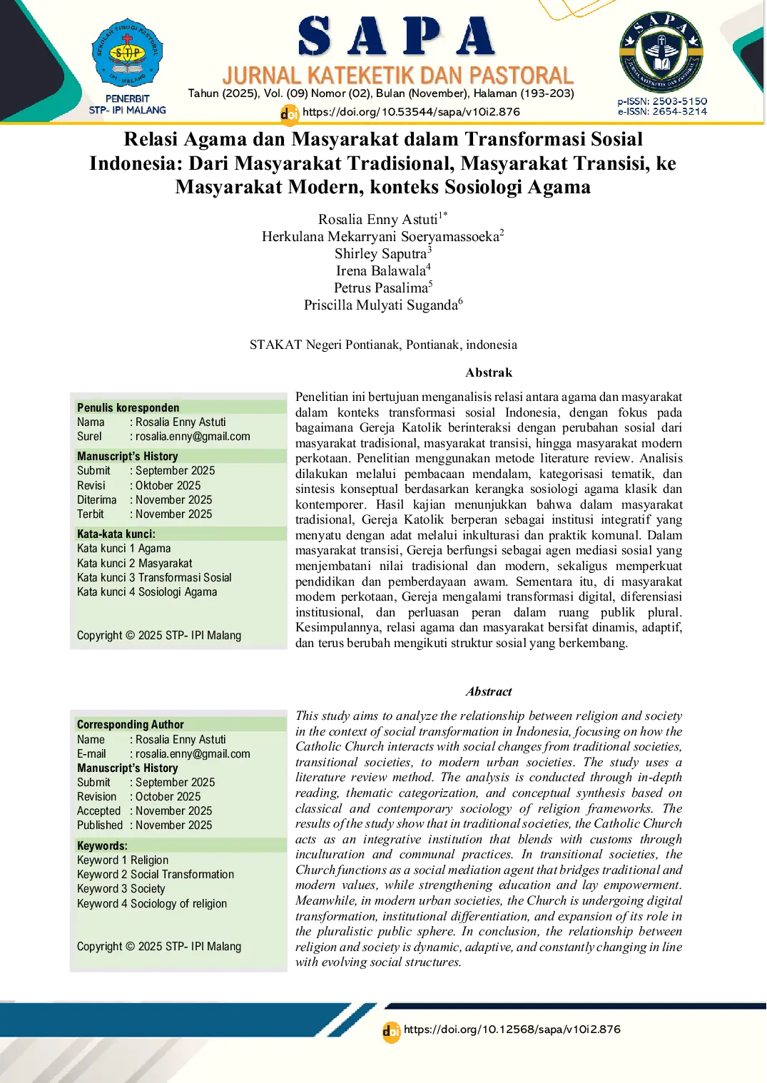Sapa: Jurnal Kateketik dan PastoralSapa: Jurnal Kateketik dan PastoralPenelitian ini bertujuan menganalisis relasi antara agama dan masyarakat dalam konteks transformasi sosial Indonesia, dengan fokus pada bagaimana Gereja Katolik berinteraksi dengan perubahan sosial dari masyarakat tradisional, masyarakat transisi, hingga masyarakat modern perkotaan. Penelitian menggunakan metode literature review. Analisis dilakukan melalui pembacaan mendalam, kategorisasi tematik, dan sintesis konseptual berdasarkan kerangka sosiologi agama klasik dan kontemporer. Hasil kajian menunjukkan bahwa dalam masyarakat tradisional, Gereja Katolik berperan sebagai institusi integratif yang menyatu dengan adat melalui inkulturasi dan praktik komunal. Dalam masyarakat transisi, Gereja berfungsi sebagai agen mediasi sosial yang menjembatani nilai tradisional dan modern, sekaligus memperkuat pendidikan dan pemberdayaan awam. Sementara itu, di masyarakat modern perkotaan, Gereja mengalami transformasi digital, diferensiasi institusional, dan perluasan peran dalam ruang publik plural.