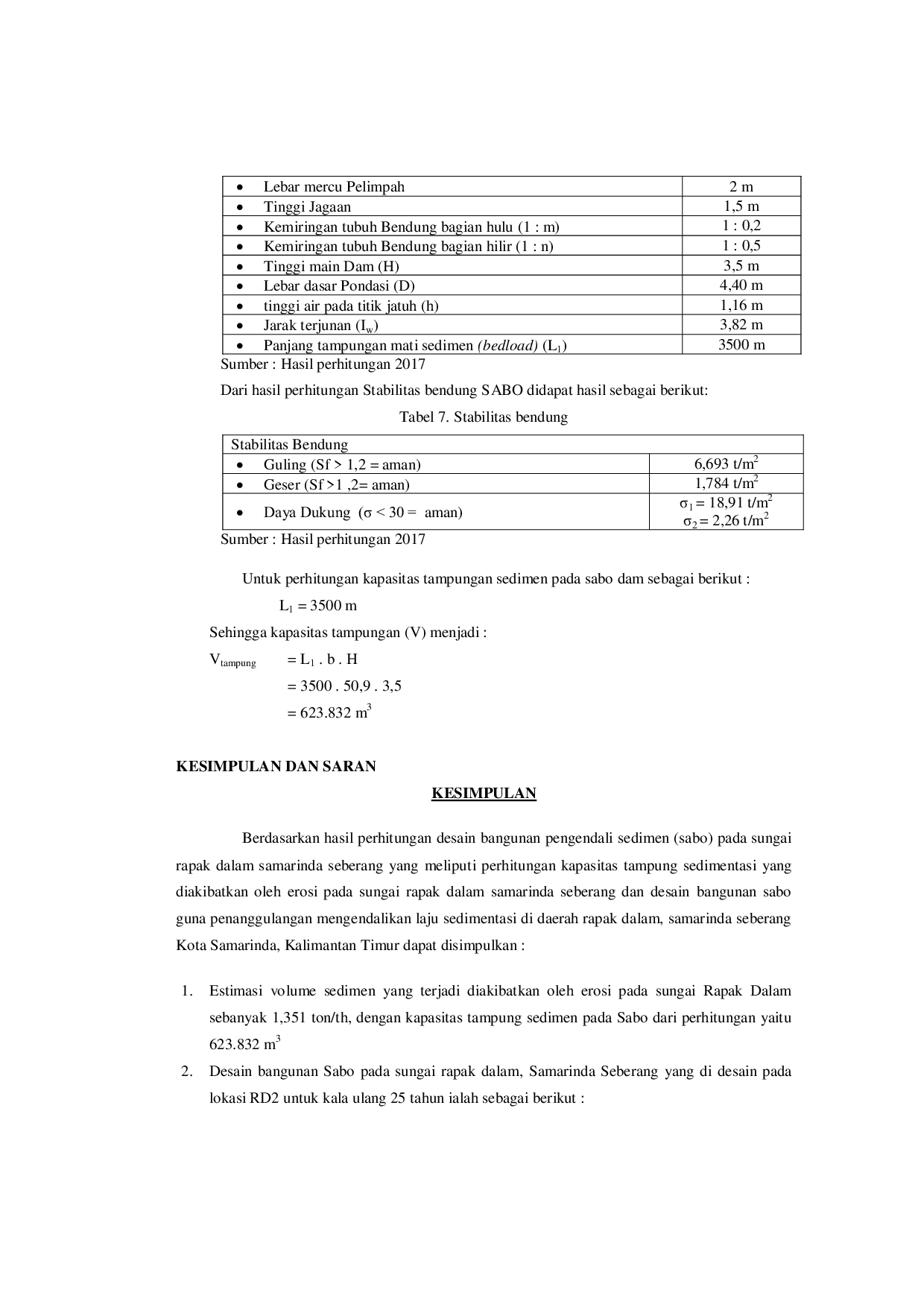 (1) Estimasi volume sedimen yang terjadi diakibatkan oleh erosi pada sungai Rapak Dalam sebanyak 1,351 ton/tahun, dengan kapasitas tampung sedimen pada Sabo dari perhitungan yaitu 623.(2) Desain bangunan Sabo pada sungai rapak dalam, Samarinda Seberang yang didesain pada lokasi RD2 untuk kala ulang 25 tahun.(3) Stabilitas bendung pada desain bangunan Sabo pada sungai rapak dalam, samarinda seberang untuk kala ulang 25 tahun.