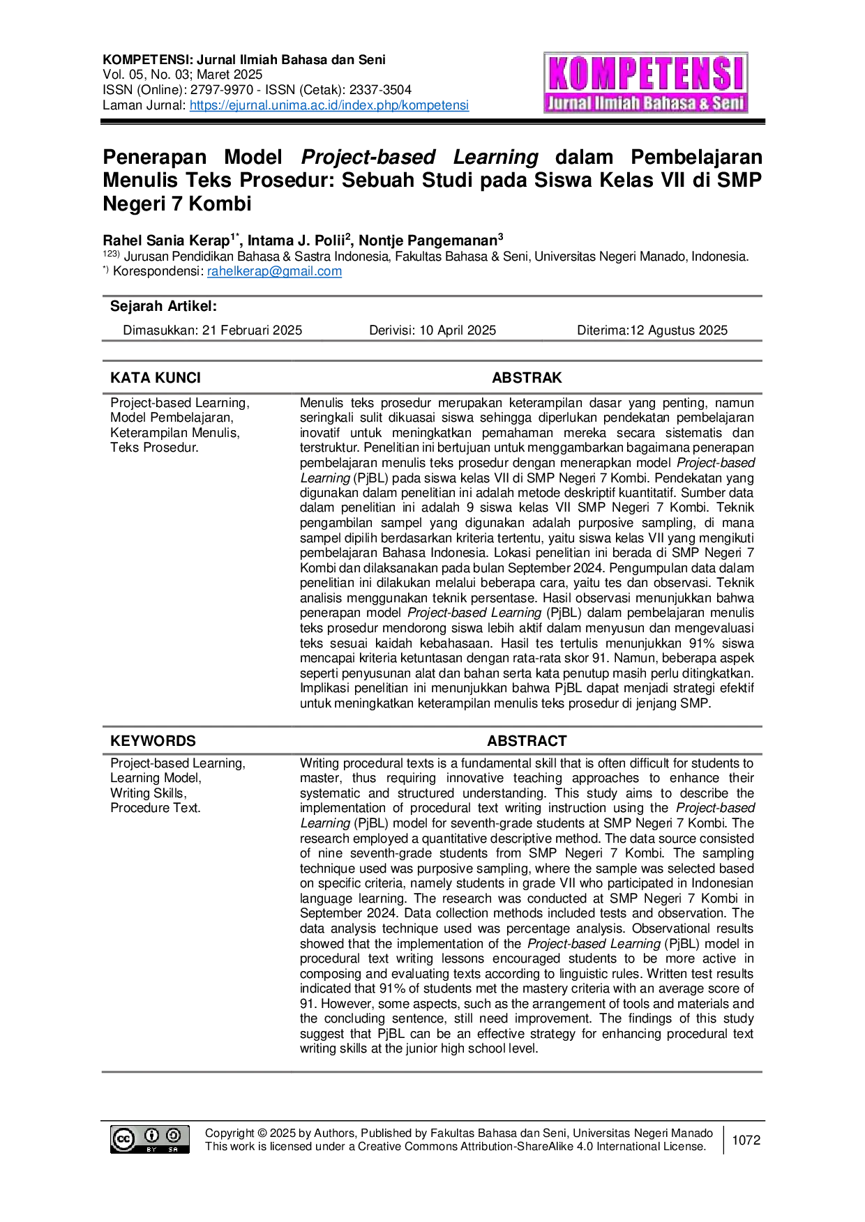 KOMPETENSIKOMPETENSIMenulis teks prosedur merupakan keterampilan dasar yang penting, namun seringkali sulit dikuasai siswa sehingga diperlukan pendekatan pembelajaran inovatif untuk meningkatkan pemahaman mereka secara sistematis dan terstruktur. Penelitian ini bertujuan untuk menggambarkan bagaimana penerapan pembelajaran menulis teks prosedur dengan menerapkan model Project-based Learning (PjBL) pada siswa kelas VII di SMP Negeri 7 Kombi. Pendekatan yang digunakan dalam penelitian ini adalah metode deskriptif kuantitatif. Sumber data dalam penelitian ini adalah 9 siswa kelas VII SMP Negeri 7 Kombi. Teknik pengambilan sampel yang digunakan adalah purposive sampling, di mana sampel dipilih berdasarkan kriteria tertentu, yaitu siswa kelas VII yang mengikuti pembelajaran Bahasa Indonesia. Lokasi penelitian ini berada di SMP Negeri 7 Kombi dan dilaksanakan pada bulan September 2024. Pengumpulan data dalam penelitian ini dilakukan melalui beberapa cara, yaitu tes dan observasi. Teknik analisis menggunakan teknik persentase. Hasil observasi menunjukkan bahwa penerapan model Project-based Learning (PjBL) dalam pembelajaran menulis teks prosedur mendorong siswa lebih aktif dalam menyusun dan mengevaluasi teks sesuai kaidah kebahasaan. Hasil tes tertulis menunjukkan 91% siswa mencapai kriteria ketuntasan dengan rata-rata skor 91. Namun, beberapa aspek seperti penyusunan alat dan bahan serta kata penutup masih perlu ditingkatkan. Implikasi penelitian ini menunjukkan bahwa PjBL dapat menjadi strategi efektif untuk meningkatkan keterampilan menulis teks prosedur di jenjang SMP.