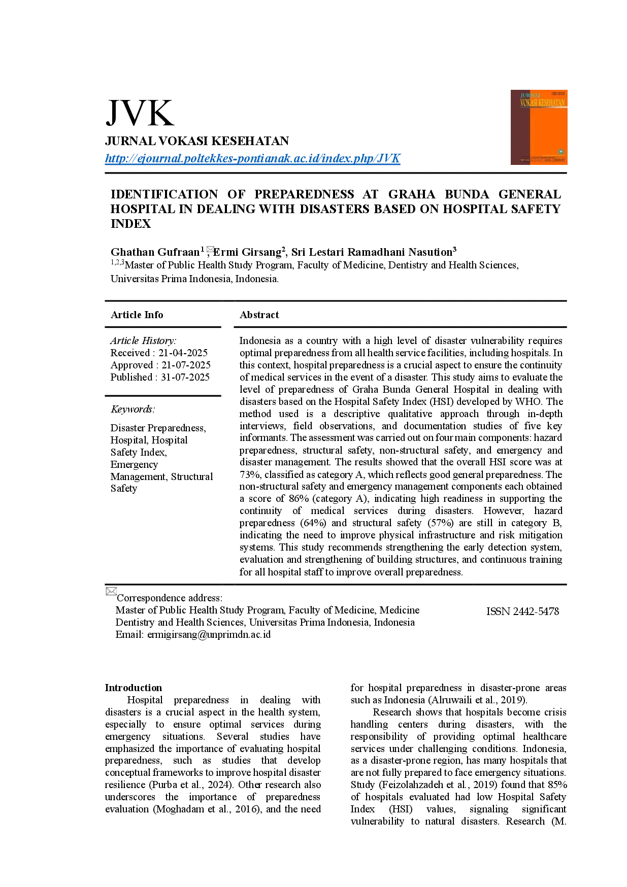 Jurnal Vokasi KesehatanJurnal Vokasi KesehatanIndonesia sebagai negara dengan tingkat kerentanan bencana yang tinggi memerlukan kesiapsiagaan yang optimal dari seluruh fasilitas pelayanan kesehatan, termasuk rumah sakit. Dalam konteks ini, kesiapsiagaan rumah sakit merupakan aspek penting untuk memastikan kelangsungan layanan medis jika terjadi bencana. Penelitian ini bertujuan untuk mengevaluasi tingkat kesiapsiagaan Rumah Sakit Umum Graha Bunda dalam menghadapi bencana berdasarkan Indeks Keselamatan Rumah Sakit (HSI) yang dikembangkan oleh WHO. Metode yang digunakan adalah pendekatan kualitatif deskriptif melalui wawancara mendalam, observasi lapangan, dan studi dokumentasi terhadap lima informan kunci. Penilaian dilakukan pada empat komponen utama: kesiapsiagaan bahaya, keselamatan struktural, keselamatan non-struktural, dan manajemen darurat dan bencana. Hasil penelitian menunjukkan bahwa skor HSI keseluruhan berada pada 73%, tergolong kategori A, yang mencerminkan kesiapsiagaan umum yang baik. Komponen keselamatan non-struktural dan manajemen darurat masing-masing memperoleh skor 86% (kategori A), mengindikasikan kesiapan tinggi dalam mendukung kelangsungan layanan medis selama bencana. Namun, kesiapsiagaan bahaya (64%) dan keselamatan struktural (57%) masih dalam kategori B, mengindikasikan perlunya peningkatan infrastruktur fisik dan sistem mitigasi risiko. Penelitian ini merekomendasikan penguatan sistem deteksi dini, evaluasi dan penguatan struktur bangunan, serta pelatihan berkelanjutan untuk seluruh staf rumah sakit untuk meningkatkan kesiapsiagaan secara keseluruhan.