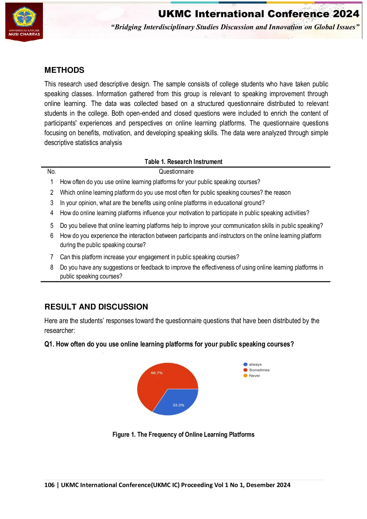 UKMC International Conference (UKMC IC) ProceedingsUKMC International Conference (UKMC IC) ProceedingsPenelitian ini menggunakan model teoritis dengan OPs sebagai variabel independen, kepuasan belajar (LS) sebagai variabel dependen, dan kualitas pembelajaran (IP) serta keterlibatan belajar (LE) sebagai variabel mediator. Penelitian ini menyelidiki efek OPs terhadap keterlibatan siswa dalam kelas berbicara di depan umum. Penelitian ini memeriksa frekuensi dan motivasi penggunaan platform online yang berbeda, keuntungan yang dirasakan dari pembelajaran online, dampaknya terhadap motivasi, keterampilan komunikasi, dan interaksi dengan instruktur, serta rekomendasi perbaikan. Data dikumpulkan melalui survei berbasis kuesioner yang diberikan kepada mahasiswa. Hasil menunjukkan adanya tren peningkatan penggunaan teknologi dalam instruksi berbicara di depan umum. Sumber daya online meningkatkan motivasi siswa, kemampuan komunikasi, dan pengalaman belajar secara keseluruhan. Meningkatkan frekuensi penggunaan platform, meningkatkan konten dan interaksi, serta mendorong keterlibatan aktif dan menyediakan lingkungan belajar yang aman dan mendukung. Penelitian ini menawarkan informasi berharga bagi pendidik dan pembuat kebijakan yang ingin mengoptimalkan efektivitas platform pembelajaran online dalam mengajar berbicara di depan umum.