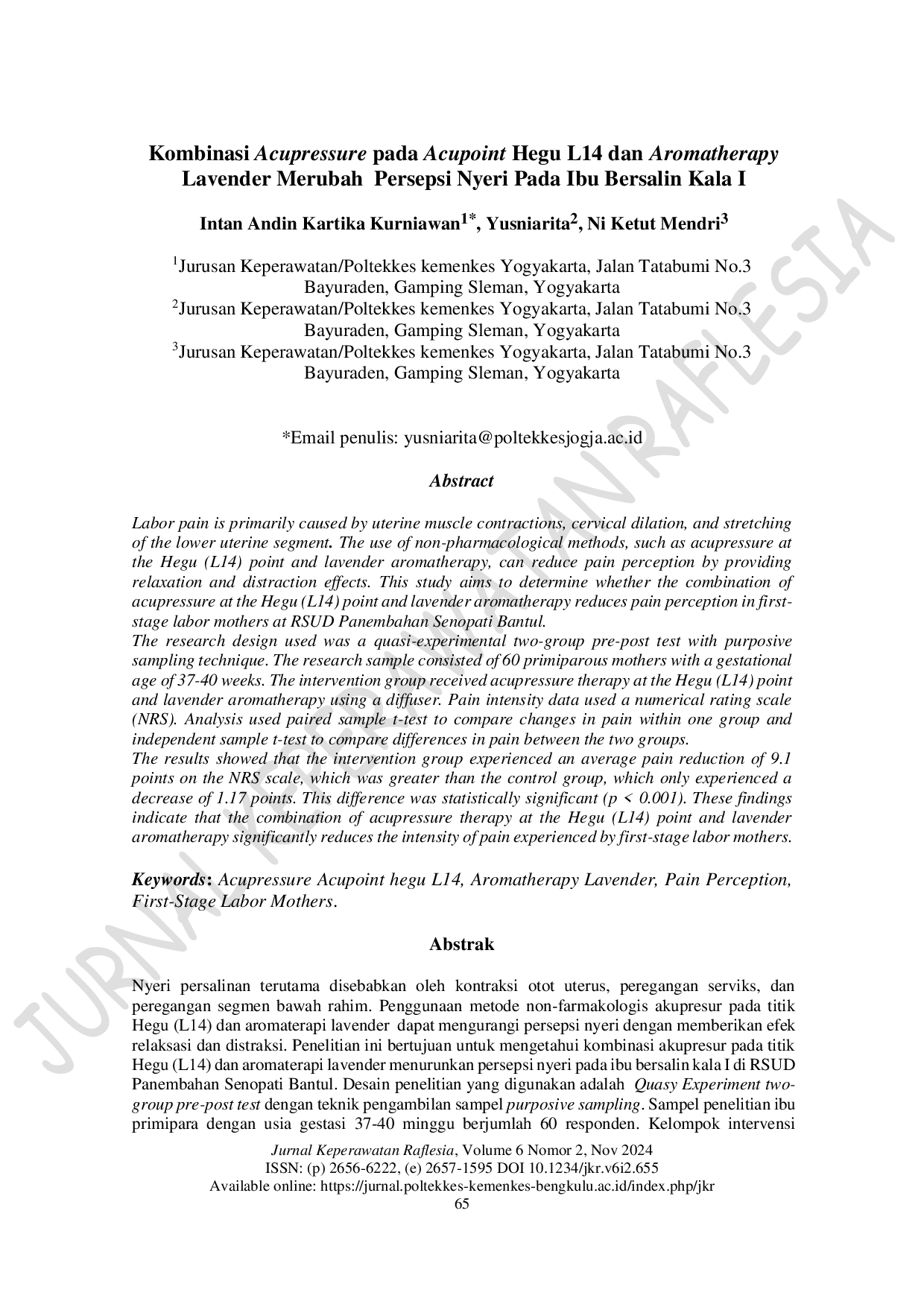 JURNAL KEPERAWATAN RAFLESIAJURNAL KEPERAWATAN RAFLESIANyeri persalinan terutama disebabkan oleh kontraksi otot uterus, peregangan serviks, dan peregangan segmen bawah rahim. Penggunaan metode non-farmakologis akupresur pada titik Hegu (L14) dan aromaterapi lavender dapat mengurangi persepsi nyeri dengan memberikan efek relaksasi dan distraksi. Penelitian ini bertujuan untuk mengetahui kombinasi akupresur pada titik Hegu (L14) dan aromaterapi lavender menurunkan persepsi nyeri pada ibu bersalin kala I di RSUD Panembahan Senopati Bantul. Desain penelitian yang digunakan adalah Quasy Experiment two-group pre-post test dengan teknik pengambilan sampel purposive sampling. Sampel penelitian ibu primipara dengan usia gestasi 37-40 minggu berjumlah 60 responden. Kelompok intervensi diberikan terapi akupresur pada titik Hegu (L14) dan aromaterapi lavender menggunakan diffuser. Data intensitas nyeri menggunakan skala numerik (NRS). Analisis menggunakan uji paired sample t-test untuk membandingkan perubahan nyeri dalam satu kelompok serta uji independent sample t-test untuk membandingkan perbedaan nyeri antara kedua kelompok. Hasil penelitian menunjukkan kelompok intervensi mengalami penurunan rata-rata nyeri sebesar 9,1 poin pada skala NRS, lebih besar dibandingkan kelompok kontrol yang hanya mengalami penurunan 1,17 poin. Perbedaan ini signifikan secara statistik (p < 0,001). Temuan ini mengindikasikan bahwa kombinasi terapi akupresur pada titik Hegu (L14) dan aromaterapi lavender secara signifikan mengurangi intensitas nyeri yang dirasakan oleh ibu bersalin pada kala I.