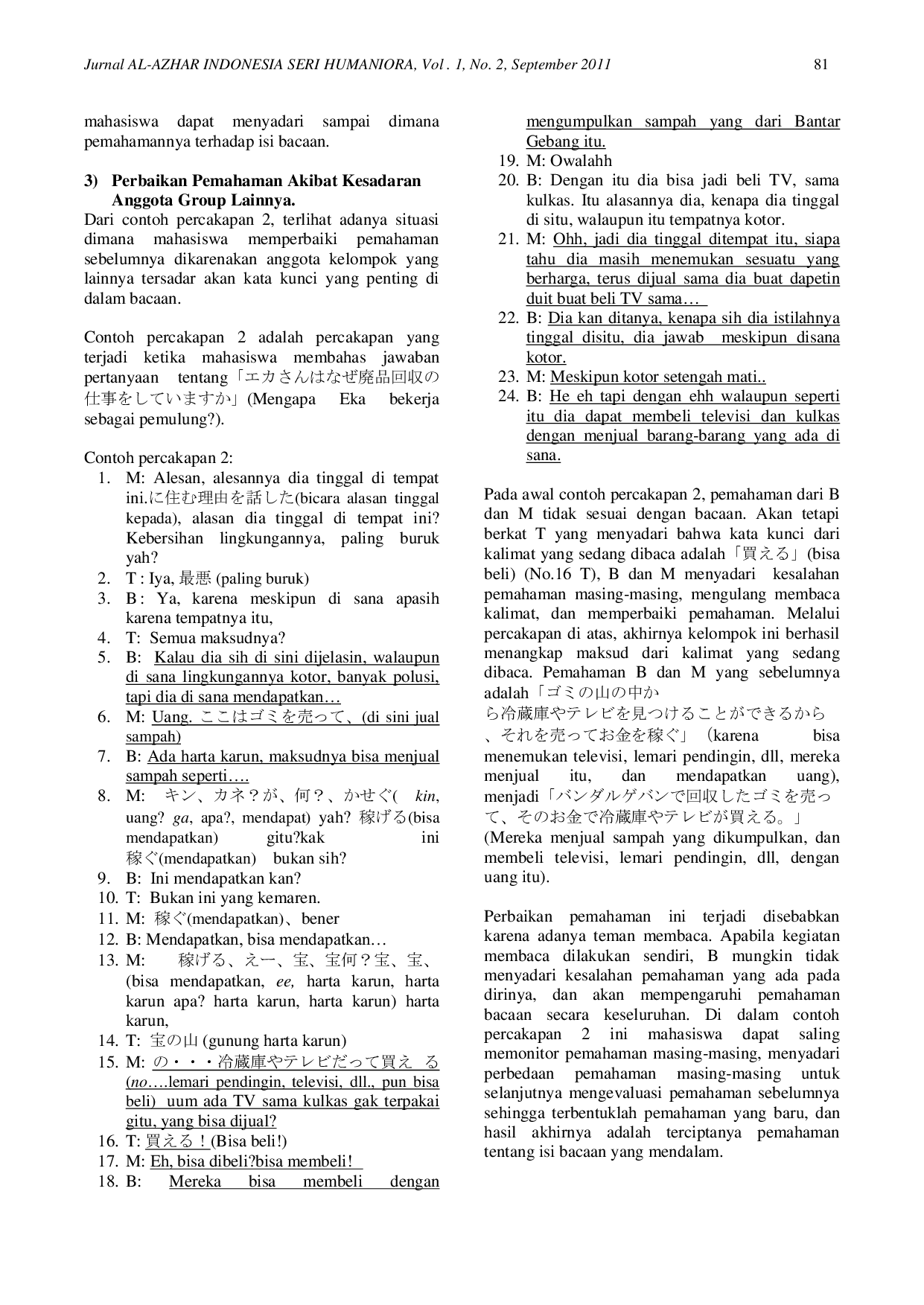 JURNAL Al-AZHAR INDONESIA SERI HUMANIORAJURNAL Al-AZHAR INDONESIA SERI HUMANIORAKeterampilan membaca yang baik diperlukan untuk membuat skripsi. Mahasiswa diharapkan bisa membaca bibliografi berbahasa Inggris, tetapi juga bahasa Jepang. Akan tetapi, bagi mahasiswa pemelajar bahasa Jepang yang berasal dari negara yang beraksara non-kanji, membaca bahan bacaan otentik seperti buku, koran, atau dokumen lainnya bukanlah hal yang mudah (terutama untuk pemelajar tingkat menengah). Fokus penelitian ini adalah mutual activity yang terjadi di kegiatan membaca berkelompok dan penggunaan prior knowledge. Hasil penelitian dapat menangkap isi bacaan otentik dalam bahasa Jepang di atas level kemampuannya. Dengan membaca dalam kelompok, mahasiswa bisa saling menggunakan sumber daya yang mereka miliki sehingga mereka bisa mengerti isi bacaan lebih dalam. Dengan menggunakan bahasa ibu, mahasiswa dapat dengan mudah menggunakan prior knowledge untuk memahami isi bahan bacaan, dan dapat saling bertanya dan memberikan pendapat secara bebas.