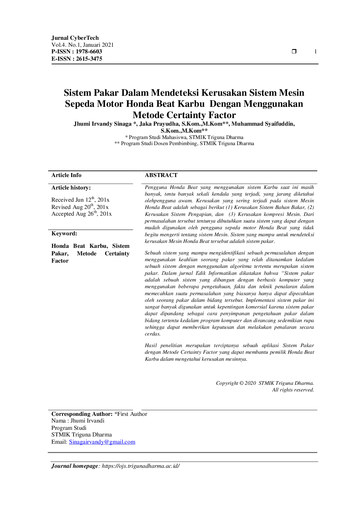 Jurnal Cyber TechJurnal Cyber TechPengguna Honda Beat yang menggunakan sistem Karbu saat ini masih banyak, tentu banyak sekali kendala yang terjadi, yang jarang diketahui oleh pengguna awam. Kerusakan yang sering terjadi pada sistem Mesin Honda Beat adalah sebagai berikut (1) Kerusakan Sistem Bahan Bakar, (2) Kerusakan Sistem Pengapian, dan (3) Kerusakan kompresi Mesin. Dari permasalahan tersebut tentunya dibutuhkan suatu sistem yang dapat dengan mudah digunakan oleh pengguna sepeda motor Honda Beat yang tidak begitu mengerti tentang sistem Mesin. Sistem yang mampu untuk mendeteksi kerusakan Mesin Honda Beat tersebut adalah sistem pakar. Sebuah sistem yang mampu mengidentifikasi sebuah permasalahan dengan menggunakan keahlian seorang pakar yang telah ditanamkan kedalam sebuah sistem dengan menggunakan algoritma tertentu merupakan sistem pakar. Dalam jurnal Edik Informatikan dikatakan bahwa “Sistem pakar adalah sebuah sistem yang dibangun dengan berbasis komputer yang menggunakan beberapa pengetahuan, fakta dan teknik penalaran dalam memecahkan suatu permasalahan yang biasanya hanya dapat dipecahkan oleh seorang pakar dalam bidang tersebut. Implementasi sistem pakar ini sangat banyak digunakan untuk kepentingan komersial karena sistem pakar dapat dipandang sebagai cara penyimpanan pengetahuan pakar dalam bidang tertentu kedalam program komputer dan dirancang sedemikian rupa sehingga dapat memberikan keputusan dan melakukan penalaran secara cerdas. Hasil penelitian merupakan terciptanya sebuah aplikasi Sistem Pakar dengan Metode Certainty Factor yang dapat membantu pemilik Honda Beat Karbu dalam mengetahui kerusakan mesinnya.
