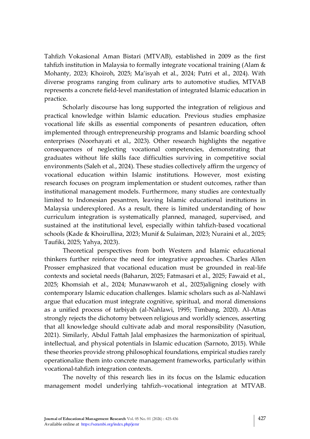 Journal of Educational Management ResearchJournal of Educational Management ResearchPengintegrasian pendidikan tahfizh dan vokasional telah menjadi pendekatan strategis bagi lembaga pendidikan Islam untuk meningkatkan relevansi lulusan dan kemandirian ekonomi. Studi ini bertujuan menganalisis model manajemen pendidikan Islam yang diterapkan di Maahad Tahfizh Vokasional Aman Bistari (MTVAB) di Malaysia, yang diakui sebagai lembaga pertama yang secara resmi mengintegrasikan penghafalan Al-Quran dengan pelatihan vokasional. Penelitian ini menggunakan metode penelitian pustaka dengan pendekatan kualitatif deskriptif. Data dianalisis dengan mengeksplorasi integrasi kurikulum, mekanisme manajerial, dan model kolaborasi eksternal yang diterapkan oleh lembaga. Temuan menunjukkan bahwa efektivitas kurikulum integratif MTVAB didukung oleh perencanaan sistematis, pengawasan industri, dan kemitraan strategis dengan badan sertifikasi profesional. Elemen-elemen ini memungkinkan lembaga untuk menyeimbangkan perkembangan spiritual dengan kompetensi vokasional. Studi ini menunjukkan bahwa model manajemen integratif dapat menjadi referensi yang layak bagi lembaga pendidikan Islam yang ingin menghasilkan lulusan yang berakar pada nilai spiritual, terampil secara profesional, dan mandiri secara ekonomi dalam masyarakat kontemporer.