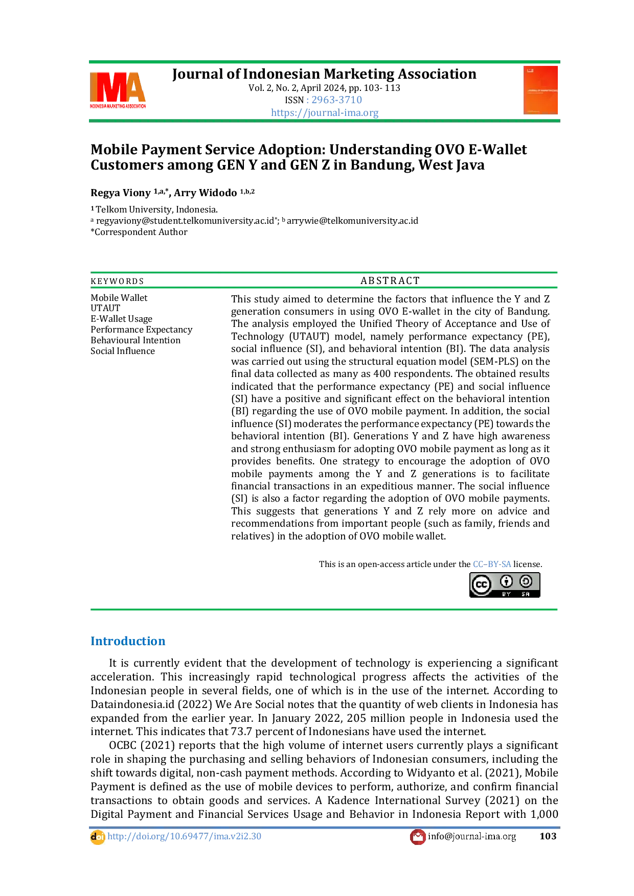 Journal of Indonesia Marketing Association (IMA)Journal of Indonesia Marketing Association (IMA)Studi ini bertujuan untuk menentukan faktor-faktor yang memengaruhi konsumen generasi Y dan Z dalam menggunakan OVO e-wallet di kota Bandung. Analisis menggunakan model Unified Theory of Acceptance and Use of Technology (UTAUT), yaitu performance expectancy (PE), social influence (SI), dan behavioral intention (BI). Analisis data dilakukan dengan structural equation model (SEM-PLS) pada data akhir yang terkumpul sebanyak 400 responden. Hasil yang diperoleh menunjukkan bahwa performance expectancy (PE) dan social influence (SI) memiliki pengaruh positif dan signifikan terhadap behavioral intention (BI) terkait penggunaan OVO mobile payment. Selain itu, social influence (SI) memoderasi performance expectancy (PE) terhadap behavioral intention (BI). Generasi Y dan Z memiliki kesadaran tinggi dan antusiasme kuat dalam mengadopsi OVO mobile payment selama memberikan manfaat. Salah satu strategi untuk mendorong adopsi OVO mobile payments di kalangan generasi Y dan Z adalah memudahkan transaksi keuangan secara cepat. Social influence (SI) juga merupakan faktor terkait adopsi OVO mobile payments. Ini menunjukkan bahwa generasi Y dan Z lebih mengandalkan saran dan rekomendasi dari orang-orang penting (seperti keluarga, teman, dan kerabat) dalam mengadopsi OVO e-wallet.