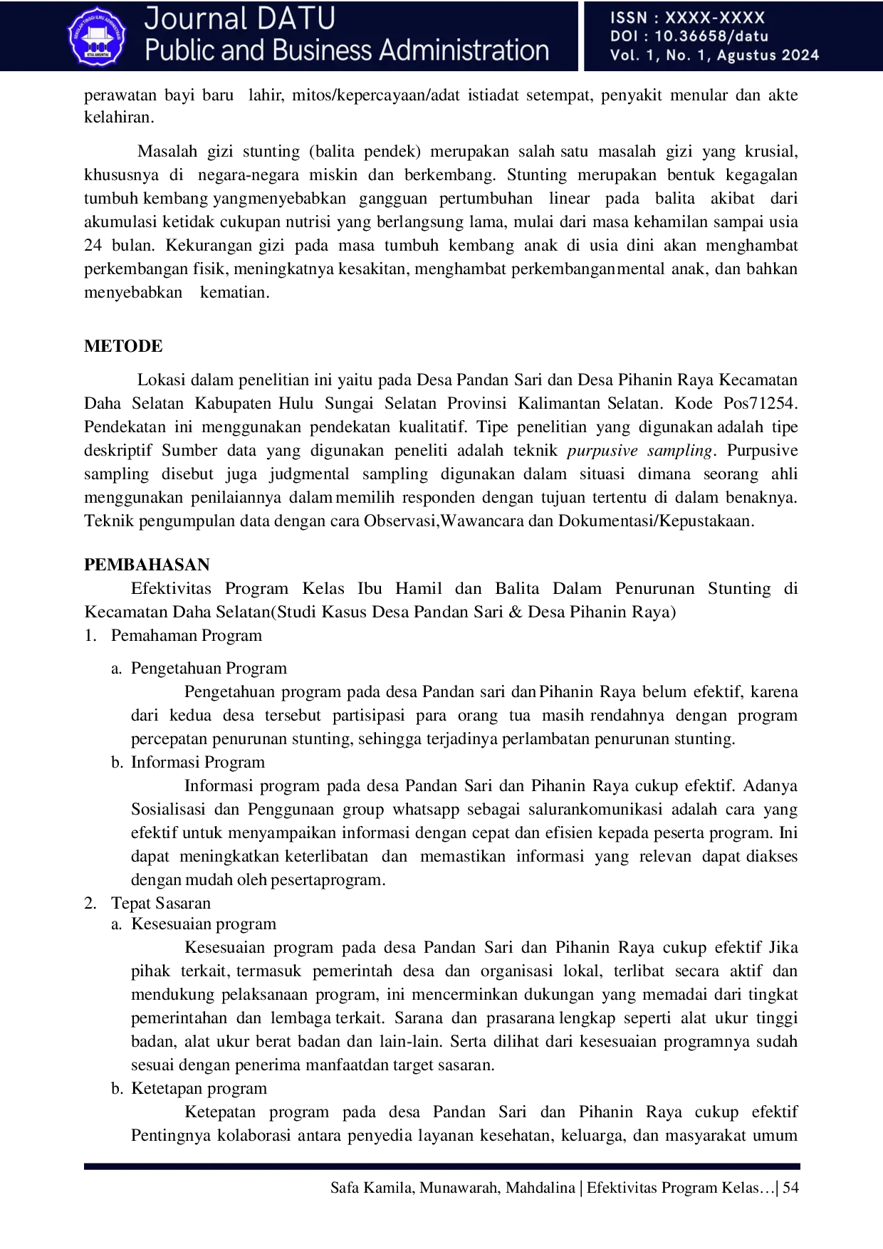 Journal of Development Administrations Thinking Understand: Public and Business Administration (DATU)Journal of Development Administrations Thinking Understand: Public and Business Administration (DATU)Tujuan penelitian ini adalah untuk mengetahui efektivitas Program Kelas Ibu Hamil dan Balita dalam penurunan stunting di Kecamatan Daha Selatan (Studi Kasus Desa Pandan Sari & Desa Pihanin Raya) dan faktor-faktor yang mempengaruhinya. Penelitian ini menggunakan pendekatan kualitatif dengan tipe deskriptif dan teknik pengumpulan data purpusive sampling. Hasil penelitian menunjukkan bahwa efektivitas program cukup baik, dilihat dari informasi program yang efektif dengan penggunaan grup WhatsApp, kesesuaian program yang didukung dengan memadai, ketepatan program yang dirasakan membantu ibu hamil dan orang tua, cepat tanggap karena koordinasi dan kerjasama, pelaksanaan program yang sesuai target, keberhasilan program yang berkelanjutan, serta dampak dan manfaat yang mengubah pola pikir orang tua. Faktor yang memengaruhi adalah pengetahuan program yang belum efektif dan partisipasi orang tua yang masih rendah. Penelitian ini menyarankan untuk mendorong partisipasi aktif masyarakat dalam kegiatan penurunan angka stunting di Desa Pandan Sari & Desa Pihanin Raya.