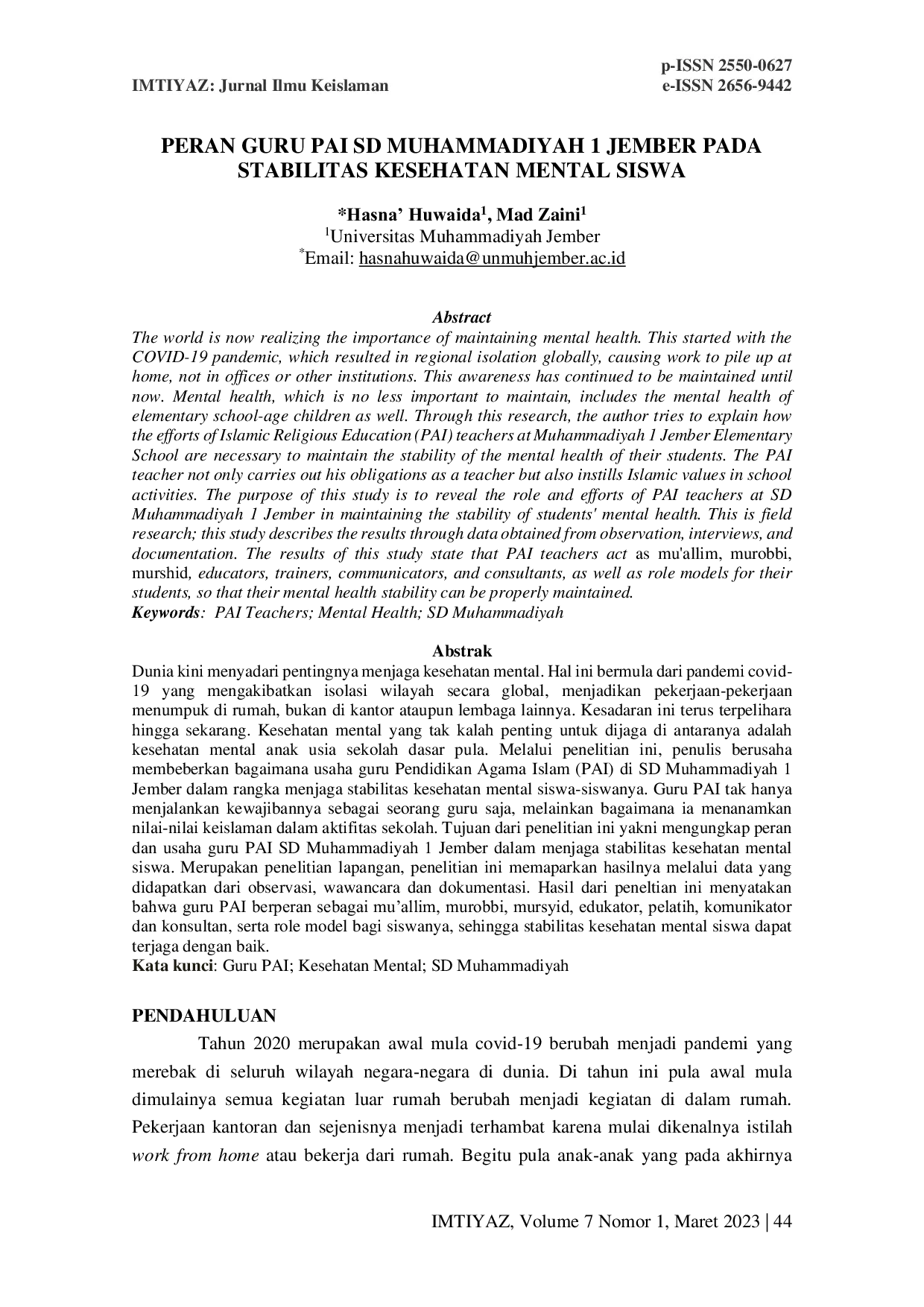Imtiyaz : Jurnal Ilmu KeislamanImtiyaz : Jurnal Ilmu KeislamanDunia kini menyadari pentingnya menjaga kesehatan mental. Hal ini bermula dari pandemi covid-19 yang mengakibatkan isolasi wilayah secara global, menjadikan pekerjaan-pekerjaan menumpuk di rumah, bukan di kantor ataupun lembaga lainnya. Kesadaran ini terus terpelihara hingga sekarang. Kesehatan mental yang tak kalah penting untuk dijaga di antaranya adalah kesehatan mental anak usia sekolah dasar pula. Melalui penelitian ini, penulis berusaha membeberkan bagaimana usaha guru Pendidikan Agama Islam (PAI) di SD Muhammadiyah 1 Jember dalam rangka menjaga stabilitas kesehatan mental siswa-siswanya. Guru PAI tak hanya menjalankan kewajibannya sebagai seorang guru saja, melainkan bagaimana ia menanamkan nilai-nilai keislaman dalam aktivitas sekolah. Tujuan dari penelitian ini yakni mengungkap peran dan usaha guru PAI SD Muhammadiyah 1 Jember dalam menjaga stabilitas kesehatan mental siswa.