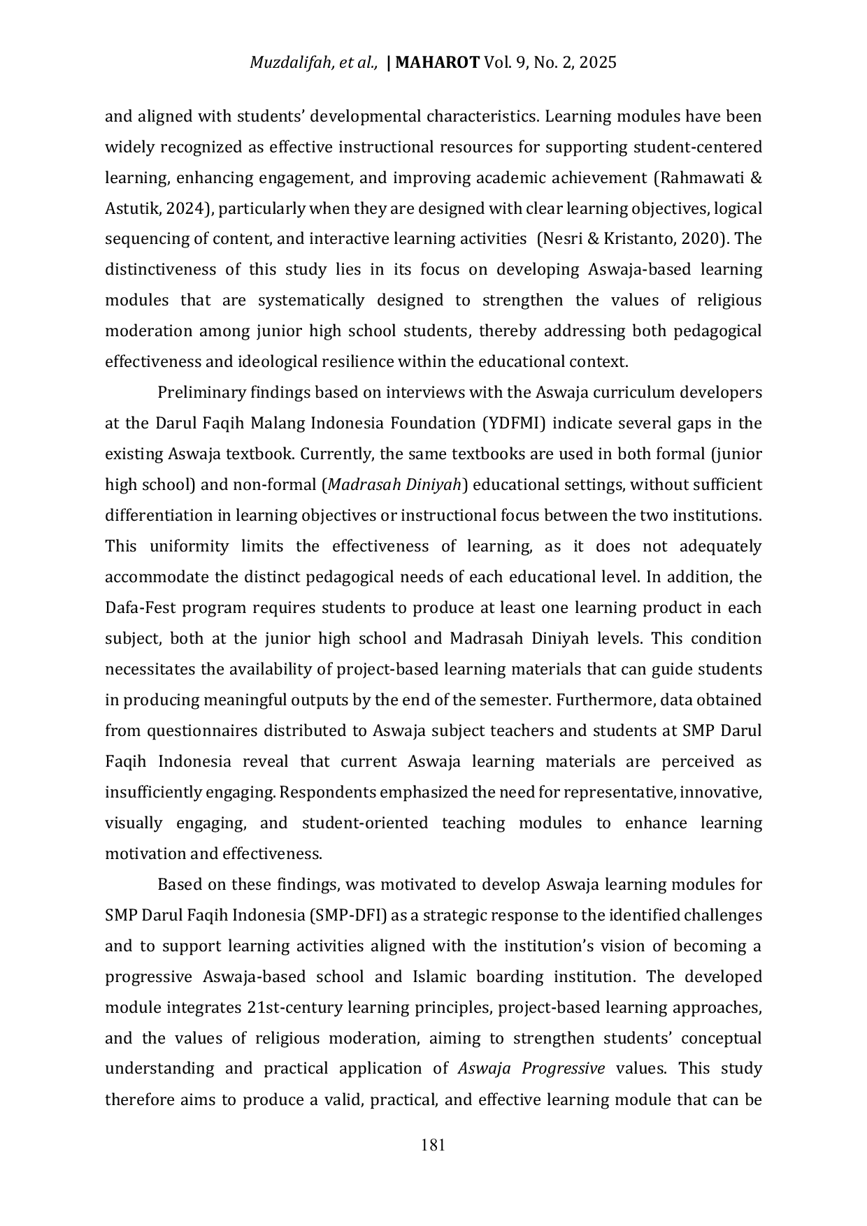 Maharot : Journal of Islamic EducationMaharot : Journal of Islamic EducationPenguatan nilai moderasi agama di sekolah memerlukan materi pembelajaran yang relevan, sistematis, dan mudah dipahami oleh siswa. Di SMP Darul Faqih Indonesia, modul Aswaja yang digunakan saat ini belum sepenuhnya memenuhi kebutuhan belajar siswa, menunjukkan kebutuhan akan sumber belajar yang lebih inovatif dan menarik. Penelitian ini bertujuan mengembangkan modul pembelajaran Aswaja yang valid untuk mendukung proses belajar dan memperkuat nilai moderasi agama. Penelitian menggunakan pendekatan penelitian dan pengembangan (R&D) dengan model ADDIE yang dimodifikasi. Data dikumpulkan melalui wawancara dan kuesioner, dianalisis dengan teknik deskriptif kualitatif dan kuantitatif. Hasil produk berupa modul Aswaja yang mengintegrasikan nilai moderasi agama, prinsip pembelajaran abad ke-21, dan media instruksional berbasis teknologi. Validasi menunjukkan tingkat kelayakan sangat tinggi, dengan skor 93% dari ahli materi, 92,92% dari ahli media, dan 98,40% dari ahli pembelajaran. Modul ini efektif memenuhi tujuan pembelajaran dan mendukung pembelajaran berbasis siswa, interaktif, serta adaptif. Secara teoretis, penelitian ini memberikan model pengembangan materi ajar Aswaja yang selaras dengan moderasi agama dan pembelajaran berbasis teknologi abad ke-21.