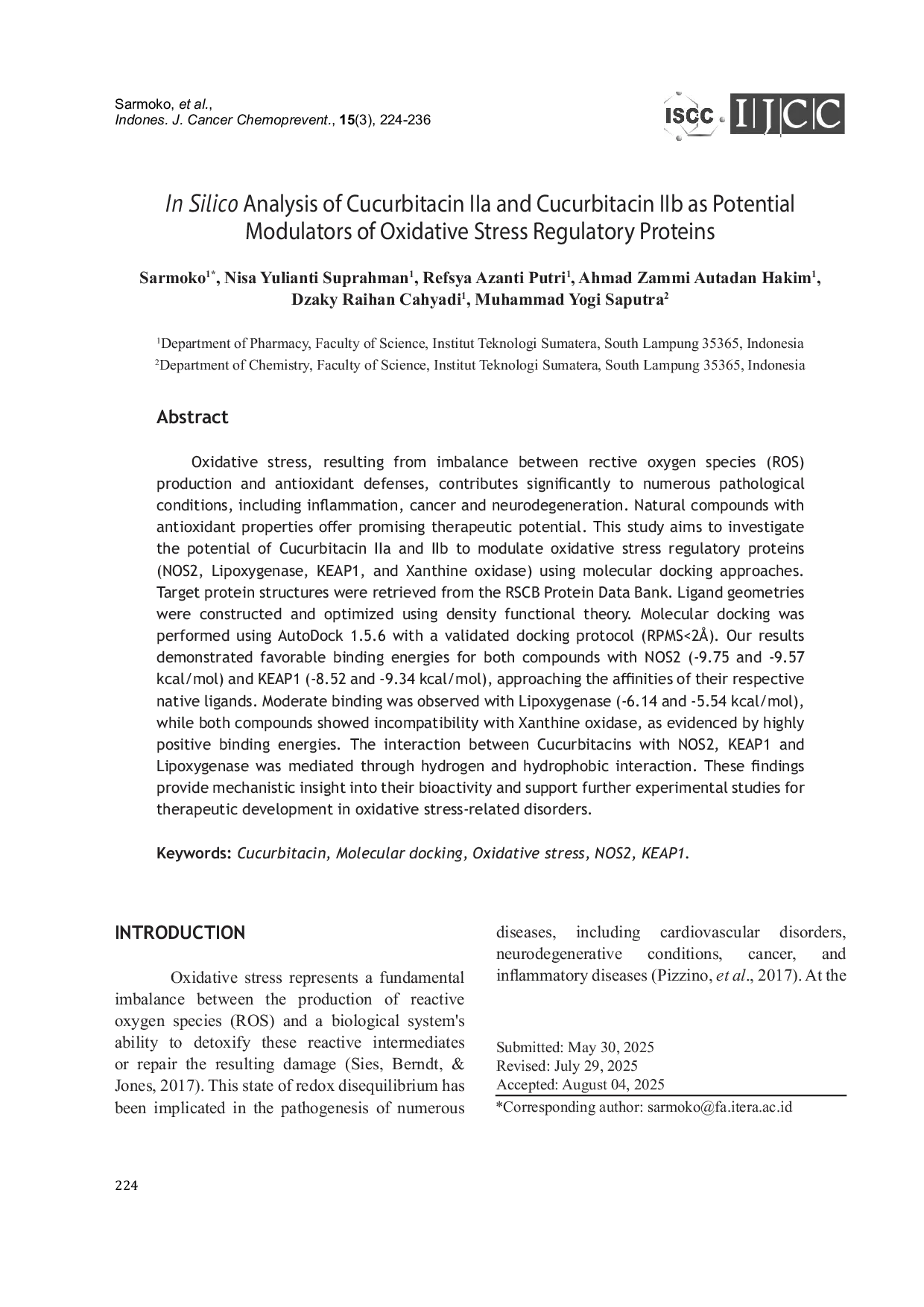 Indonesian Journal of Cancer ChemopreventionIndonesian Journal of Cancer ChemopreventionStres oksidatif, yang timbul akibat ketidakseimbangan antara produksi spesies oksigen reaktif (ROS) dan pertahanan antioksidan, berkontribusi secara signifikan pada berbagai kondisi patologis, termasuk peradangan, kanker, dan neurodegenerasi. Senyawa alami dengan sifat antioksidan menawarkan potensi terapeutik yang menjanjikan. Penelitian ini bertujuan untuk menyelidiki potensi Cucurbitacin IIa dan IIb dalam memodulasi protein regulator stres oksidatif (NOS2, Lipoxygenase, KEAP1, dan Xanthine oxidase) menggunakan pendekatan docking molekuler. Struktur protein target diambil dari Protein Data Bank (RCSB). Geometri ligan dibangun dan dioptimalkan dengan teori fungsi kerapatan. Docking molekuler dilakukan menggunakan AutoDock 1.5.6 dengan protokol docking tervalidasi (RPMS<2 Å). Hasil kami menunjukkan energi ikatan yang menguntungkan untuk kedua senyawa terhadap NOS2 (−9,75 dan −9,57 kcal/mol) serta KEAP1 (−8,52 dan −9,34 kcal/mol), mendekati afinitas ligan asli masing‑masing. Ikatan sedang teramati pada Lipoxygenase (−6,14 dan −5,54 kcal/mol), sedangkan kedua senyawa menunjukkan ketidakcocokan dengan Xanthine oxidase, terbukti oleh energi ikatan yang sangat positif. Interaksi antara Cucurbitacin dengan NOS2, KEAP1, dan Lipoxygenase dimediasi oleh ikatan hidrogen dan hidrofobik. Temuan ini memberikan wawasan mekanistik tentang bioaktivitasnya dan mendukung studi eksperimental lanjutan untuk pengembangan terapeutik pada gangguan terkait stres oksidatif.