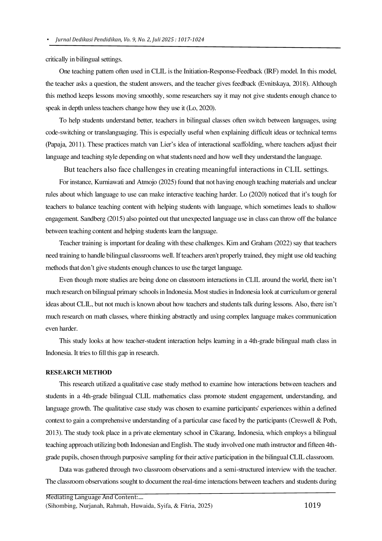 Jurnal Dedikasi PendidikanJurnal Dedikasi PendidikanPenelitian ini menyelidiki bagaimana interaksi antara guru dan siswa memengaruhi keterlibatan siswa, pemahaman, dan perkembangan bahasa dalam kelas Matematika bilingual berbasis CLIL (Content and Language Integrated Learning). Tujuan dari studi ini adalah untuk menelaah bagaimana interaksi tersebut mendukung pembelajaran baik dari segi konten maupun bahasa. Penelitian ini menggunakan metode kualitatif dengan melakukan dua observasi kelas dan satu wawancara semi-terstruktur dengan seorang guru kelas empat di SD Presiden. Temuan menunjukkan bahwa guru menerapkan pendekatan yang berpusat pada siswa melalui strategi seperti pertanyaan terbuka, contoh-contoh dari kehidupan nyata, dan scaffolding bilingual yang konsisten. Metode ini secara signifikan meningkatkan keterlibatan siswa dan secara bertahap mengembangkan kemampuan bahasa Inggris mereka dalam konteks pembelajaran Matematika. Meskipun Bahasa Indonesia tetap menjadi bahasa utama yang digunakan siswa dalam mengekspresikan diri, meningkatnya penggunaan Bahasa Inggris untuk istilah-istilah matematika kunci menunjukkan adanya paparan bahasa yang positif. Studi ini menyimpulkan bahwa interaksi antara guru dan siswa dalam kelas bilingual CLIL memainkan peran penting dalam mendukung perkembangan ganda—pemahaman matematika dan akuisisi bahasa Inggris—dengan menciptakan lingkungan belajar yang interaktif, suportif, dan kaya secara linguistik.