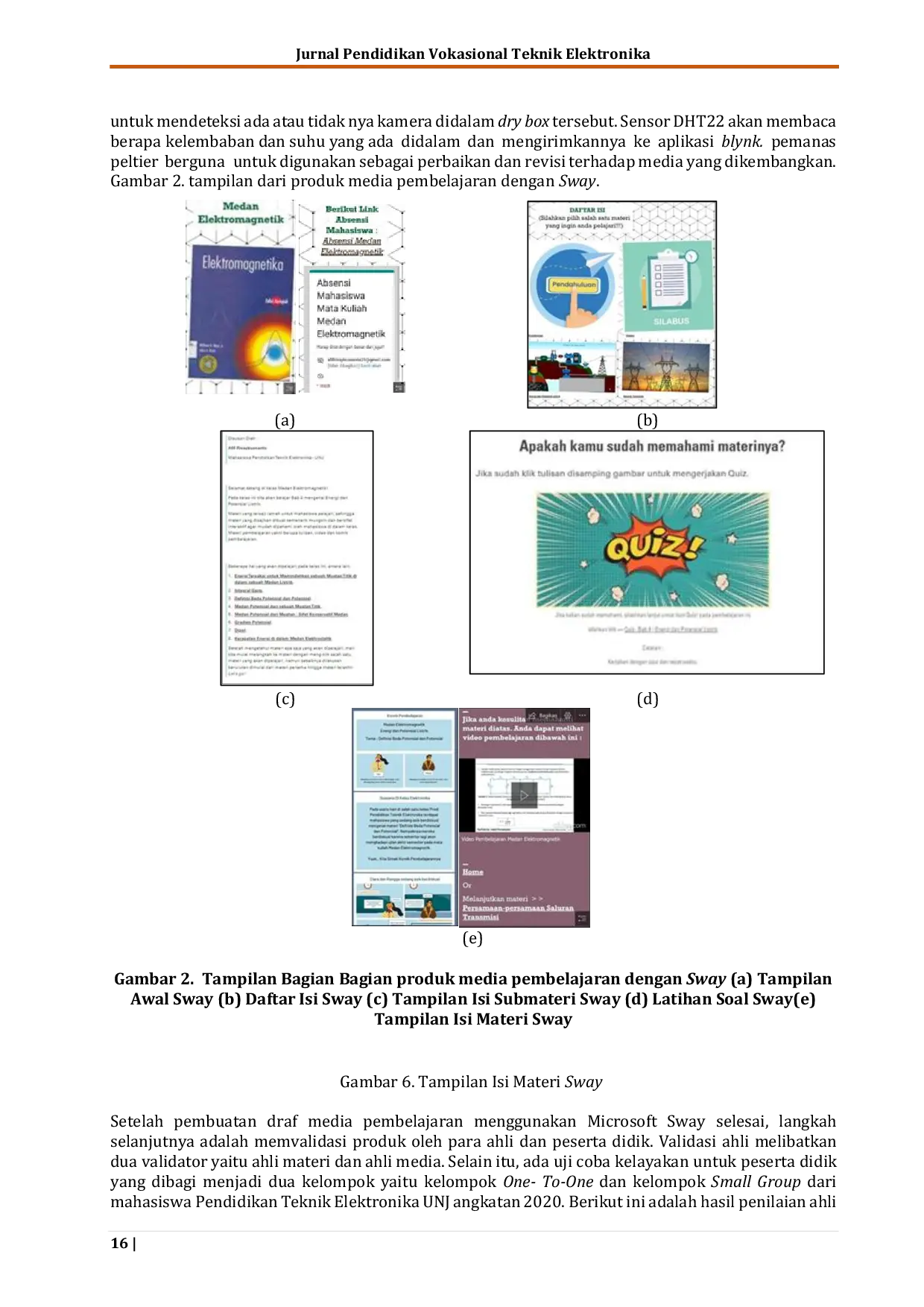 JURNAL PENDIDIKAN VOKASIONAL TEKNIK ELEKTRONIKA (JVoTE)JURNAL PENDIDIKAN VOKASIONAL TEKNIK ELEKTRONIKA (JVoTE)Penelitian ini bertujuan untuk mengembangkan media pembelajaran Microsoft Sway pada mata kuliah Medan Elektromagnetik untuk mahasiswa Prodi Pendidikan Teknik Elektronika Universitas Negeri Jakarta dan menguji tingkat kelayakan media. Penelitian ini menggunakan metode Research and Development (RnD) dengan model ADDIE yang meliputi; Analisis, Perancangan, Pengembangan, Implementasi, dan Evaluasi. Hasil pengembangan media pembelajaran Microsoft Sway pada mata kuliah Medan Elektomagnetik digunakan pada materi Energi dan Potensial Listrik dan Saluran Transmisi. Berdasarkan kategori kelayakan, dapat disimpulkan bahwa media pembelajaran Microsoft Sway yang dikembangkan pada mata kuliah Medan Elektromagnetik dapat dikategorikan sangat layak untuk digunakan sebagai media pembelajaran.