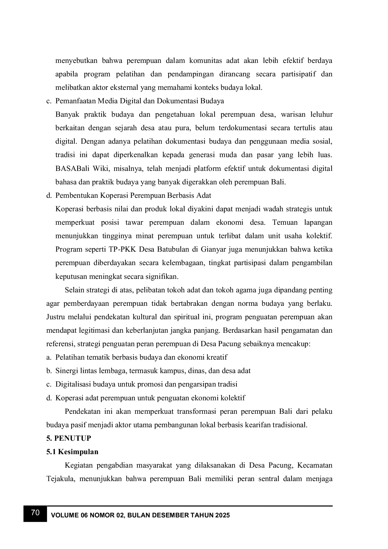 Perempuan Bali memiliki peran sentral dalam menjaga kearifan lokal melalui pelestarian tradisi, pengelolaan lingkungan, dan penguatan ekonomi keluarga.Tradisi lokal seperti kerajinan, kuliner, dan ritual memiliki potensi besar dikembangkan sebagai sumber ekonomi kreatif.Strategi penguatan meliputi pelatihan berkala, kolaborasi lintas lembaga, digitalisasi budaya, serta pembentukan koperasi perempuan adat.Revitalisasi kearifan lokal melalui peran perempuan menjadi jalan strategis untuk pembangunan desa yang berkelanjutan, inklusif, dan berbasis masyarakat.