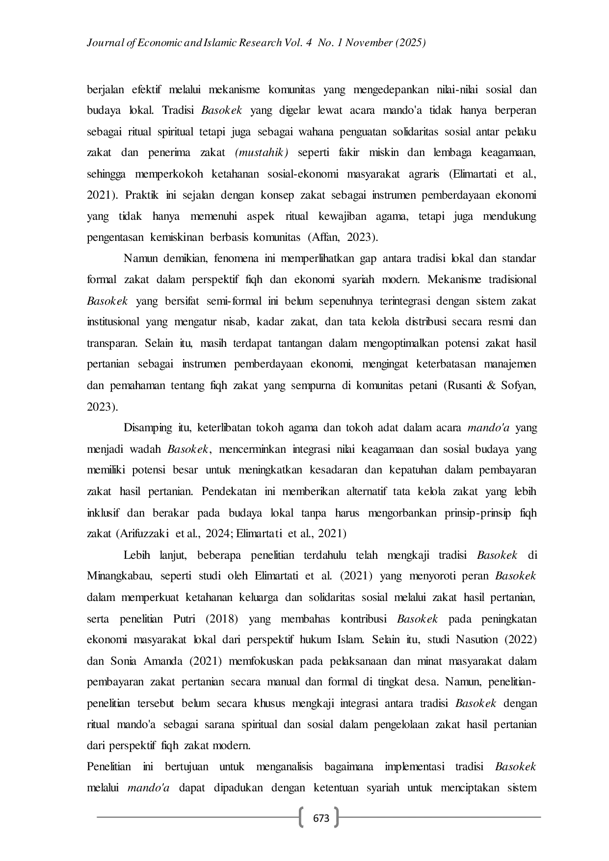 Journal of Economic and Islamic ResearchJournal of Economic and Islamic ResearchPenelitian ini mengkaji implementasi tradisi Basokek dalam sistem pembagian zakat hasil pertanian melalui acara Mandoa di Minangkabau dari perspektif Islam. Tradisi Basokek merupakan mekanisme distribusi zakat pertanian yang terintegrasi dengan kearifan lokal dan syukuran. Metode penelitian yang digunakan adalah kualitatif dengan pendekatan studi lapangan di Kecamatan Lima Kaum, Kabupaten Tanah Datar. Hasil penelitian menunjukkan bahwa Basokek berfungsi sebagai sarana distribusi zakat yang efektif dalam memperkuat solidaritas sosial dan kesadaran berzakat di kalangan petani. Namun, ditemukan juga beberapa ketidaksesuaian dengan prinsip fikih, terutama dalam hal penentuan mustahik, akurasi perhitungan kadar zakat, dan frekuensi pembayaran. Tradisi ini dapat dikategorikan sebagai urf shahih selama tetap selaras dengan maqashid al-shariah. Untuk mengoptimalkan fungsi zakat, penelitian ini mengusulkan model integratif yang memadukan kearifan lokal dengan tata kelola zakat modern melalui edukasi berbasis budaya, kolaborasi kelembagaan, dan optimalisasi peran tokoh masyarakat sebagai amil komunitas.