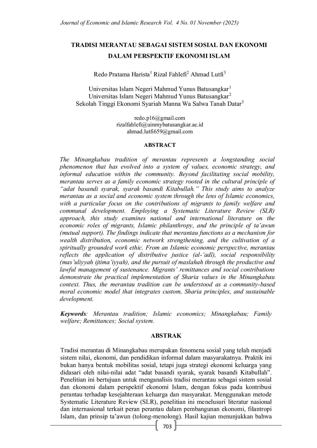 Journal of Economic and Islamic ResearchJournal of Economic and Islamic ResearchTradisi merantau di Minangkabau merupakan fenomena sosial yang telah menjadi sistem nilai, ekonomi, dan pendidikan informal dalam masyarakatnya. Praktik ini bukan hanya bentuk mobilitas sosial, tetapi juga strategi ekonomi keluarga yang didasari oleh nilai-nilai adat adat basandi syarak, syarak basandi Kitabullah. Penelitian ini bertujuan untuk menganalisis , dengan fokus pada kontribusi perantau terhadap kesejahteraan keluarga dan masyarakat. Menggunakan metode Systematic Literature Review (SLR), penelitian ini menelusuri literatur nasional dan internasional terkait peran perantau dalam pembangunan ekonomi, filantropi Islam, dan prinsip taawun (tolong-menolong). Hasil kajian menunjukkan bahwa merantau telah menjadi mekanisme sosial yang mendistribusikan kekayaan, memperkuat jaringan ekonomi, dan meningkatkan etos kerja berbasis nilai spiritual. Dari perspektif ekonomi Islam, aktivitas merantau mencerminkan penerapan prinsip keadilan distributif (masuliyyah ijtimaiyyah), serta pencapaian maslahah melalui pengelolaan rezeki yang produktif dan halal. Remitansi dan kontribusi sosial perantau menjadi wujud nyata implementasi nilai syariah dalam konteks lokal Minangkabau. Dengan demikian, tradisi merantau dapat dipahami sebagai model ekonomi moral berbasis komunitas yang mengintegrasikan adat, syariah, dan pembangunan berkelanjutan.