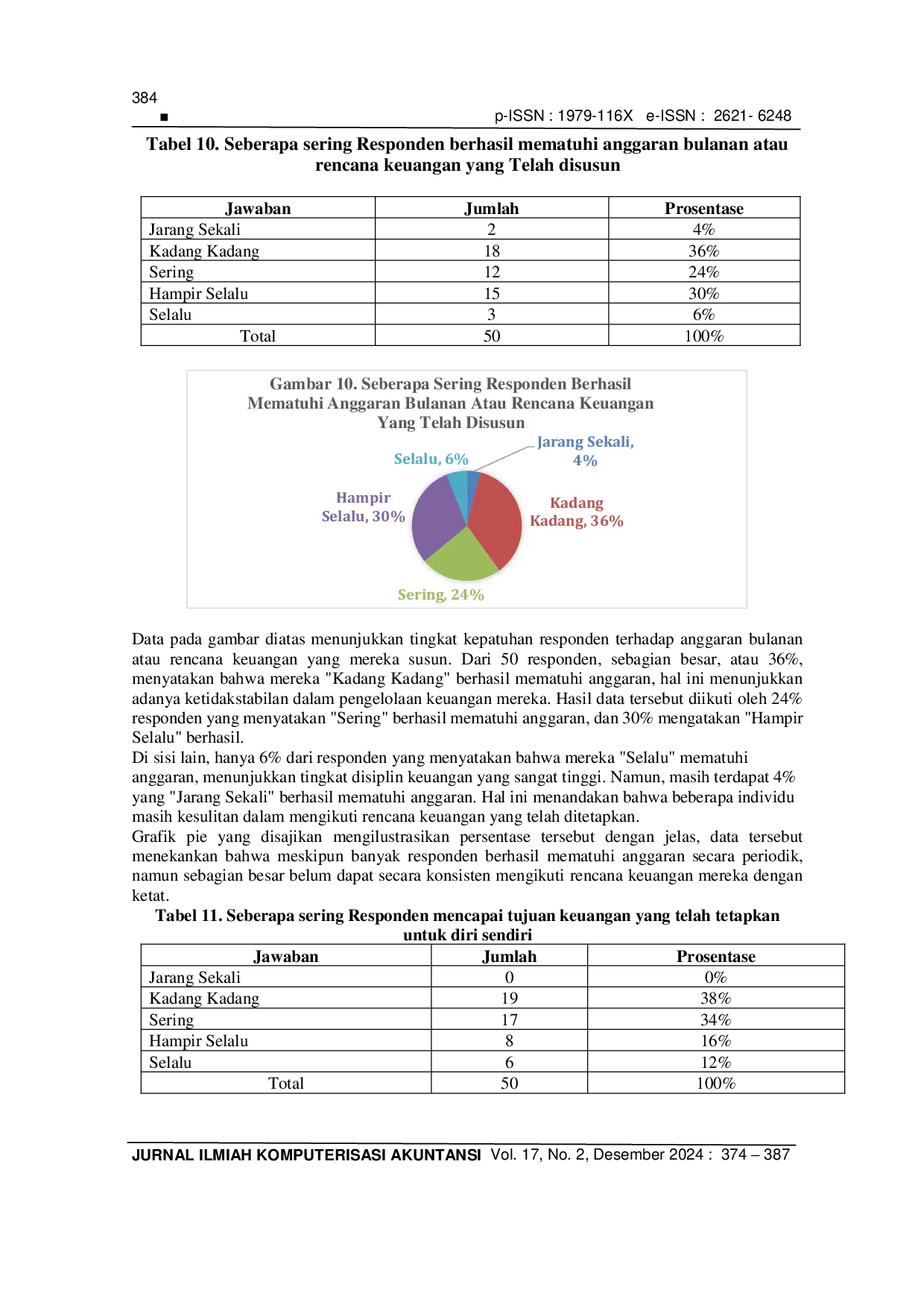 Kompak :Jurnal Ilmiah Komputerisasi AkuntansiKompak :Jurnal Ilmiah Komputerisasi AkuntansiPengelolaan keuangan yang baik merupakan aspek penting dalam kehidupan mahasiswa, terutama bagi mereka yang belajar di bidang ekonomi. Mahasiswa ekonomi diharapkan memiliki pemahaman mendalam tentang manajemen keuangan pribadi dan perencanaan keuangan jangka panjang. Namun, tidak semua mahasiswa memiliki kemampuan yang sama dalam mengelola keuangan. Penelitian ini bertujuan untuk menganalisis faktor-faktor yang mempengaruhi pola pengelolaan keuangan mahasiswa Fakultas Ekonomi dan Bisnis, Universitas Brawijaya. Metode penelitian menggunakan survei lintas-seksi dengan mengumpulkan data dari 50 mahasiswa melalui kuesioner terstruktur. Hasil penelitian menunjukkan bahwa faktor-faktor yang mempengaruhi pengelolaan keuangan mahasiswa adalah pendapatan bulanan, pengetahuan keuangan, pengalaman dalam pengelolaan keuangan, dukungan sosial, dan kebutuhan serta tujuan keuangan pribadi. Saran yang dapat diberikan kepada universitas adalah menyediakan bimbingan kepada mahasiswa, seperti pelatihan rutin tentang pengelolaan keuangan, mengundang pakar keuangan untuk seminar atau kuliah tamu, dan menyelenggarakan konseling keuangan mahasiswa.
