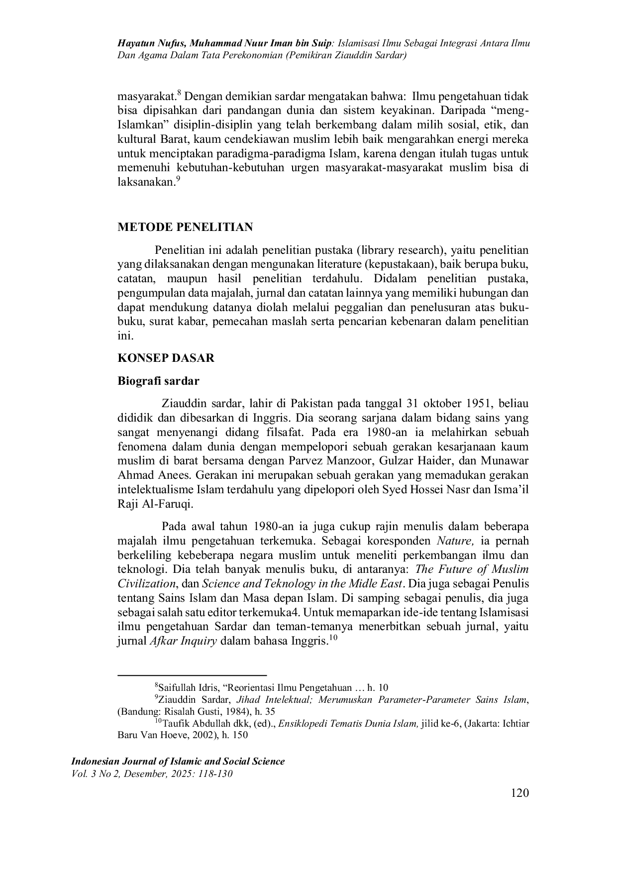 Indonesian Journal of Islamic and Social ScienceIndonesian Journal of Islamic and Social ScienceDalam penelitian ini lebih memfokuskan pemikiran ziauddin sardar dalam tata perekonomian syariah, tetapi penulis juga membahas terkait islamisasi ilmu, Islamisasi ilmu sebagai salah satu model integrasi yang ditegaskan oleh Arkom Kuswanjono, bahwa model terbaik dari hubungan antara agama dan sains adalah model integrasi. Dalam tatanan ekonomi bagi agama islam, tata ekonomi internasional baru itu berarti meninggalkan kebangkrutan sistem barat dan menuju kepada sistem islam. Prinsip-prinsip ekonomi Islam yang dijadikan dasar bagi tata perekonomian bagi kaum muslim. Dalam pandanga sardar parameter sains islam terpacu kepada sepuluh konsep nilai epistemologi yaitu tauhid, khalifah, ilm, ibadah, halal, haram, adl, dhulm, istishlah, dan dhiya.