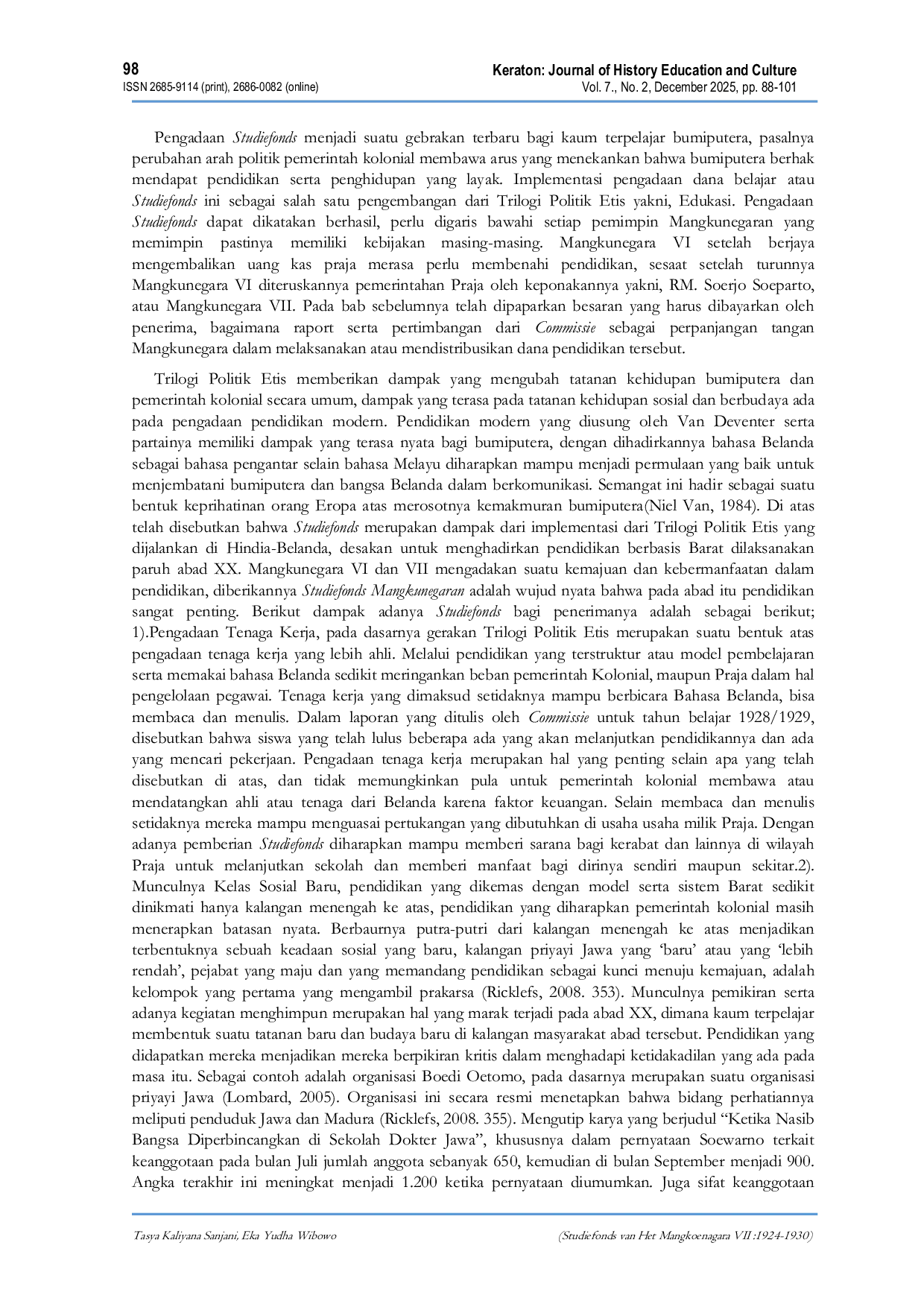 Keraton: Journal of History Education and CultureKeraton: Journal of History Education and CulturePenelitian ini meneliti pelaksanaan Studiefonds Van Het Mangkoenagara VII (1924–1930) sebagai manifestasi konkret Trilogi Politik Etis, khususnya pada bidang pendidikan di Praja Mangkunegaran. Tujuan penelitian ini adalah: (1) menganalisis mekanisme distribusi dan pelaksanaan Studiefonds, (2) mengevaluasi peran Mangkunegara VII dalam pengelolaan dana pendidikan, dan (3) mengidentifikasi dampaknya terhadap Sentana dan Abdi Dalem. Metode yang digunakan adalah metode sejarah yang meliputi tahap heuristik (arsip Mangkunegaran, laporan tahunan Studiefonds), kritik sumber, interpretasi, dan historiografi. Hasil penelitian menunjukkan bahwa Studiefonds terbagi menjadi dua tipe: Studiefonds A (dana dari kas Praja) dan Studiefonds B (dana dari cicilan penerima sebelumnya). Kebijakan ini berhasil meningkatkan akses pendidikan modern bagi bumiputera, meskipun terbatas pada elit Praja. Dampak signifikan meliputi: (1) lahirnya tenaga terdidik untuk kebutuhan administrasi kolonial dan Praja, (2) munculnya kelas sosial baru berpendidikan. Peran Mangkunegara VII tercermin dalam pendirian Commissie van Advies yang mengawasi distribusi dana serta perluasan sekolah Mangkunegaran. Kebaruan penelitian terletak pada temuan bahwa Studiefonds menjadi model unik pendanaan pendidikan berbasis komunitas pada era kolonial serta mencerminkan semangat otonomi terbatas Praja Mangkunegaran. Krisis ekonomi tahun 1930 menjadi faktor penurunan efektivitas program.
