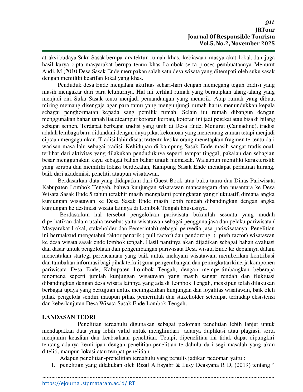 Journal Of Responsible TourismJournal Of Responsible TourismPenelitian ini membahas tentang faktor penarik (pull factor) dan faktor pendorong (push factor) wisatawan ke Desa Wisata Sasak Ende Kabupaten Lombok Tengah. Hasil penelitian diuraikan dalam beberapa jawaban terhadap rumusan-rumusan masalah yaitu faktor penarik apa saja yang mempengaruhi wisatawan berkunjung ke Desa Wisata Sasak Ende dan faktor pendorong apa saja yang ikut mempengaruhi keinginan wisatawan berkunjung ke Desa Wisata Sasak Ende. Dengan menggunakan metode wawancara, observasi, dokumentasi dan menggunakan teknik analisis data diskriptif kualitatif. Hasil penelitian menunjukkan bahwa Faktor penarik (pull factor) wisatawan berkunjung Kedesa Wisata Sasak Ende Lombok Tengah diantaranya cuaca/iklim destinasi, transportasi/ akses, atraksi pariwisata,amenitas, adanya keterlibatan Lembaga wisata,lingkungan hidup yang alami dan juga buatan, mampu menjadi faktor-faktor penarik minta wisatawan, sedangkan terdapat 12 faktor pendorong wisaatawan berkunjung ke Desa Wisata Sasak Ende yaitu play, Strengthening family bonds, Prestige, Social interaction, Educational opportunity, Self-fulfilment, Romance, Wish fulfillment, Financial Security, Leisure time escape, Relaxation.