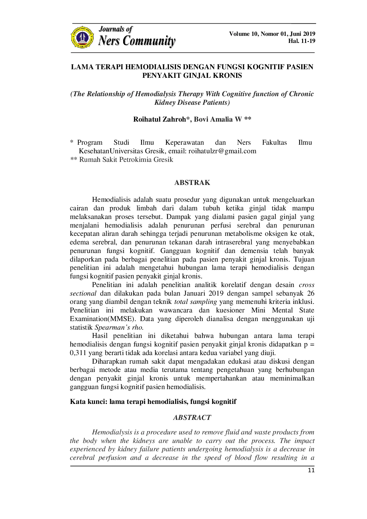 Journals of Ners CommunityJournals of Ners CommunityHemodialisis adalah suatu prosedur yang digunakan untuk mengeluarkan cairan dan produk limbah dari dalam tubuh ketika ginjal tidak mampu melaksanakan proses tersebut. Dampak yang dialami pasien gagal ginjal yang menjalani hemodialisis adalah penurunan perfusi serebral dan penurunan kecepatan aliran darah sehingga terjadi penurunan metabolisme oksigen ke otak, edema serebral, dan penurunan tekanan darah intraserebral yang menyebabkan penurunan fungsi kognitif. Gangguan kognitif dan demensia telah banyak dilaporkan pada berbagai penelitian pada pasien penyakit ginjal kronis. Tujuan penelitian ini adalah mengetahui hubungan . Penelitian ini adalah penelitian analitik korelatif dengan desain cross sectional dan dilakukan pada bulan Januari 2019 dengan sampel sebanyak 26 orang yang diambil dengan teknik total sampling yang memenuhi kriteria inklusi. Penelitian ini melakukan wawancara dan kuesioner Mini Mental State Examination(MMSE). Data yang diperoleh dianalisa dengan menggunakan uji statistik Spearmans rho. Hasil penelitian ini diketahui bahwa hubungan antara didapatkan p = 0,311 yang berarti tidak ada korelasi antara kedua variabel yang diuji.