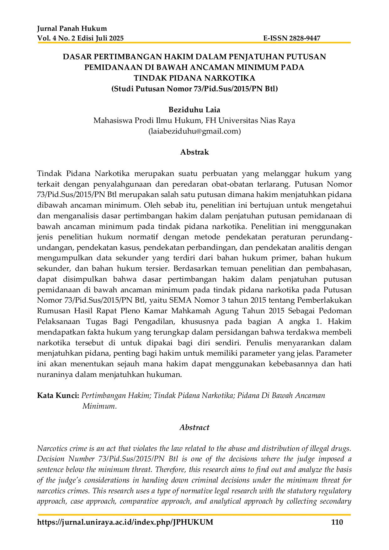 Jurnal Panah HukumJurnal Panah HukumTindak Pidana Narkotika merupakan suatu perbuatan yang melanggar hukum yang terkait dengan penyalahgunaan dan peredaran obat-obatan terlarang. Putusan Nomor 73/Pid.Sus/2015/PN Btl merupakan salah satu putusan dimana hakim menjatuhkan pidana dibawah ancaman minimum. Oleh sebab itu, penelitian ini bertujuan untuk mengetahui dan menganalisis dasar pertimbangan hakim dalam penjatuhan putusan pemidanaan di bawah ancaman minimum pada tindak pidana narkotika. Penelitian ini menggunakan jenis penelitian hukum normatif dengan metode pendekatan peraturan perundang-undangan, pendekatan kasus, pendekatan perbandingan, dan pendekatan analitis dengan mengumpulkan data sekunder yang terdiri dari bahan hukum primer, bahan hukum sekunder, dan bahan hukum tersier. Berdasarkan temuan penelitian dan pembahasan, dapat disimpulkan bahwa dasar pertimbangan hakim dalam penjatuhan putusan pemidanaan di bawah ancaman minimum pada tindak pidana narkotika pada Putusan Nomor 73/Pid.Sus/2015/PN Btl, yaitu SEMA Nomor 3 tahun 2015 tentang Pemberlakukan Rumusan Hasil Rapat Pleno Kamar Mahkamah Agung Tahun 2015 Sebagai Pedoman Pelaksanaan Tugas Bagi Pengadilan, khususnya pada bagian A angka 1. Hakim mendapatkan fakta hukum yang terungkap dalam persidangan bahwa terdakwa membeli narkotika tersebut di untuk dipakai bagi diri sendiri.