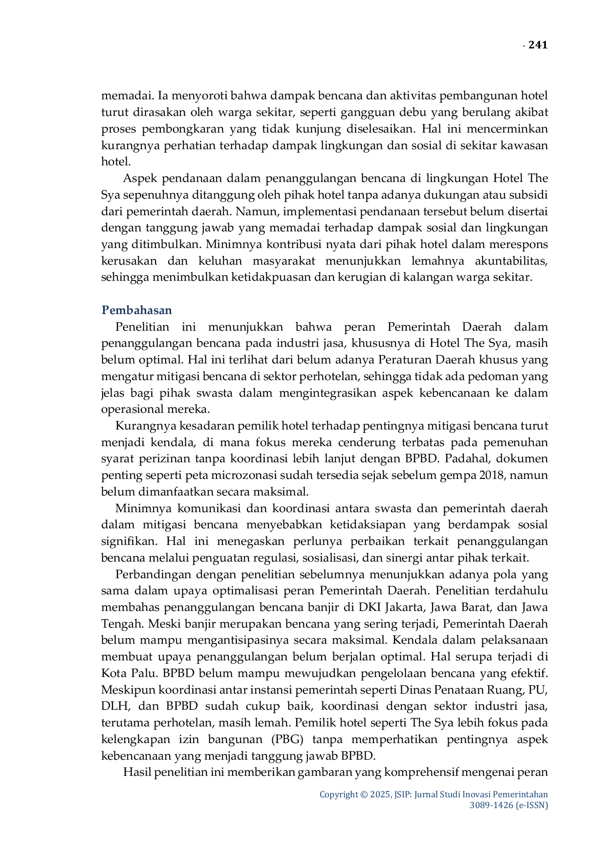 Jurnal Studi Inovasi PemerintahanJurnal Studi Inovasi PemerintahanKota Palu merupakan wilayah rawan bencana, dan peristiwa tahun 2018 telah berdampak besar pada sektor jasa, khususnya perhotelan. Peran pemerintah daerah dalam penanggulangan bencana masih menghadapi kendala dalam hal koordinasi, infrastruktur, dan keterlibatan swasta. Tujuan dari penelitian ini adalah menganalisis peran pemerintah daerah dalam penanggulangan bencana pada Hotel The Sya, berdasarkan teori peran pemerintah daerah dari Sri Heryati. Penelitian ini menggunakan metode kualitatif dengan pendekatan studi kasus pada Hotel The Sya Palu untuk mengkaji optimalisasi peran pemerintah daerah dalam mitigasi dan penanganan bencana di sektor jasa. Data diperoleh melalui wawancara, observasi, dan dokumentasi. Wawancara dilakukan dengan enam informan kunci yaitu, BPBD, manajemen Hotel The Sya, dan masyarakat sekitar Hotel. Hasil penelitian menunjukkan bahwa meskipun terdapat upaya dari pemerintah daerah dalam bentuk pelatihan dan sosialisasi, sinergi dengan pihak hotel belum berjalan secara optimal akibat minimnya regulasi teknis dan koordinasi lintas sektor. Penelitian ini menyarankan perlunya kebijakan terpadu dan peningkatan kemitraan antara pemerintah dan sektor jasa guna memperkuat ketahanan terhadap bencana di masa mendatang. Penelitian ini diharapkan dapat di jadikan referensi oleh pihak-pihak terkait yang melakukan penanggulangan bencana pada industri jasa.