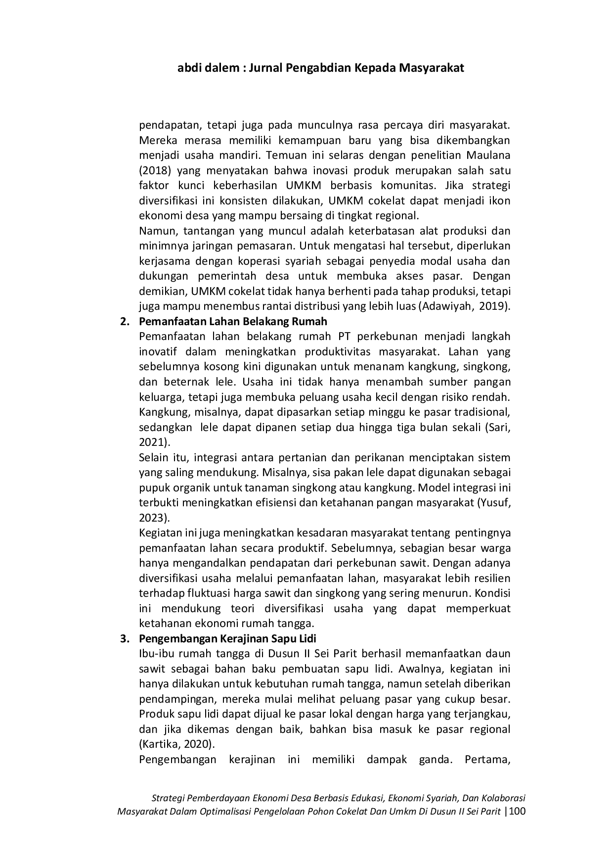 ABDI DALEM: Jurnal Pengabdian Kepada MasyarakatABDI DALEM: Jurnal Pengabdian Kepada MasyarakatDusun II Sei Parit, Kecamatan Sei Rampah memiliki potensi besar dalam pengembangan ekonomi masyarakat melalui sektor perkebunan, pertanian, dan perikanan. Namun, pengelolaan UMKM buah cokelat masih terbatas pada produksi bahan mentah tanpa adanya diversifikasi produk bernilai tambah. Selain itu, masyarakat juga mengelola lahan perkebunan sawit, kangkung, dan singkong serta kolam ikan lele dalam skala kecil. Masalah utama yang dihadapi adalah minimnya edukasi pengolahan hasil, keterbatasan modal, dan belum adanya sistem ekonomi berbasis syariah yang mendukung keberlanjutan usaha. Melalui strategi pemberdayaan berbasis edukasi, ekonomi syariah, dan kolaborasi masyarakat, kegiatan ini bertujuan untuk meningkatkan kapasitas masyarakat dalam mengembangkan UMKM cokelat dan usaha produktif lainnya. Metode yang digunakan meliputi pelatihan, penyuluhan, dan pendampingan dalam pengolahan produk, penguatan kelembagaan koperasi syariah, serta membangun kemitraan dengan perusahaan sekitar. Hasil kegiatan menunjukkan adanya peningkatan keterampilan pengolahan cokelat, kesadaran akan prinsip ekonomi syariah, serta semangat kolaborasi masyarakat dalam memanfaatkan sumber daya desa. Pemberdayaan ini diharapkan mampu menciptakan kemandirian ekonomi desa secara berkelanjutan.