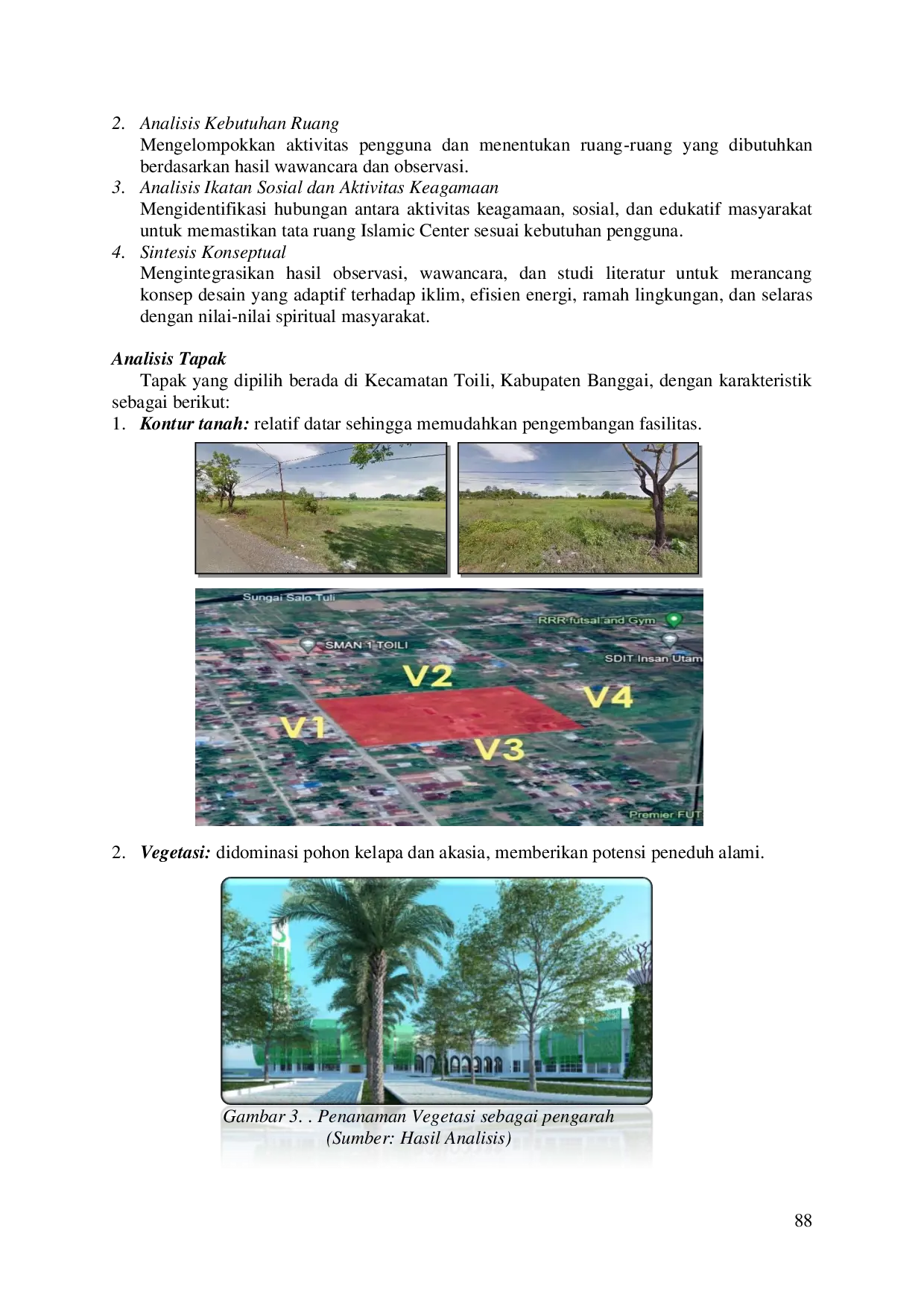 SIPARSTIKA: Jurnal Ilmiah Ilmu-Ilmu TeknikSIPARSTIKA: Jurnal Ilmiah Ilmu-Ilmu TeknikPerkembangan wilayah Kecamatan Toili di Kabupaten Banggai menunjukkan peningkatan jumlah penduduk dan aktivitas sosial keagamaan yang cukup signifikan. Namun, belum terdapat fasilitas keislaman yang mampu mewadahi berbagai kegiatan keagamaan, pendidikan, dan sosial masyarakat secara terpadu. Penelitian ini bertujuan untuk merancang Islamic Center dengan pendekatan arsitektur ekologis, yaitu konsep perancangan yang memperhatikan keseimbangan antara kebutuhan manusia dan kelestarian lingkungan. Metode penelitian yang digunakan adalah pendekatan kualitatif-deskriptif, melalui analisis tapak, iklim, vegetasi, orientasi bangunan, serta kebutuhan ruang pengguna. Hasil penelitian menunjukkan bahwa penerapan prinsip arsitektur ekologi seperti pemanfaatan energi alami, sistem ventilasi silang, pengelolaan air hujan, dan penggunaan material lokal mampu mewujudkan bangunan yang hemat energi dan ramah lingkungan. Konsep desain tekanan pada integrasi antara fungsi ibadah, pendidikan, dan sosial dengan tata ruang yang terbuka dan hijau. Dengan demikian, Islamic Center di Kecamatan Toili diharapkan menjadi pusat aktivitas keislaman yang berkelanjutan dan mampu menjadi ikon religi dan ekologis di wilayah Banggai.