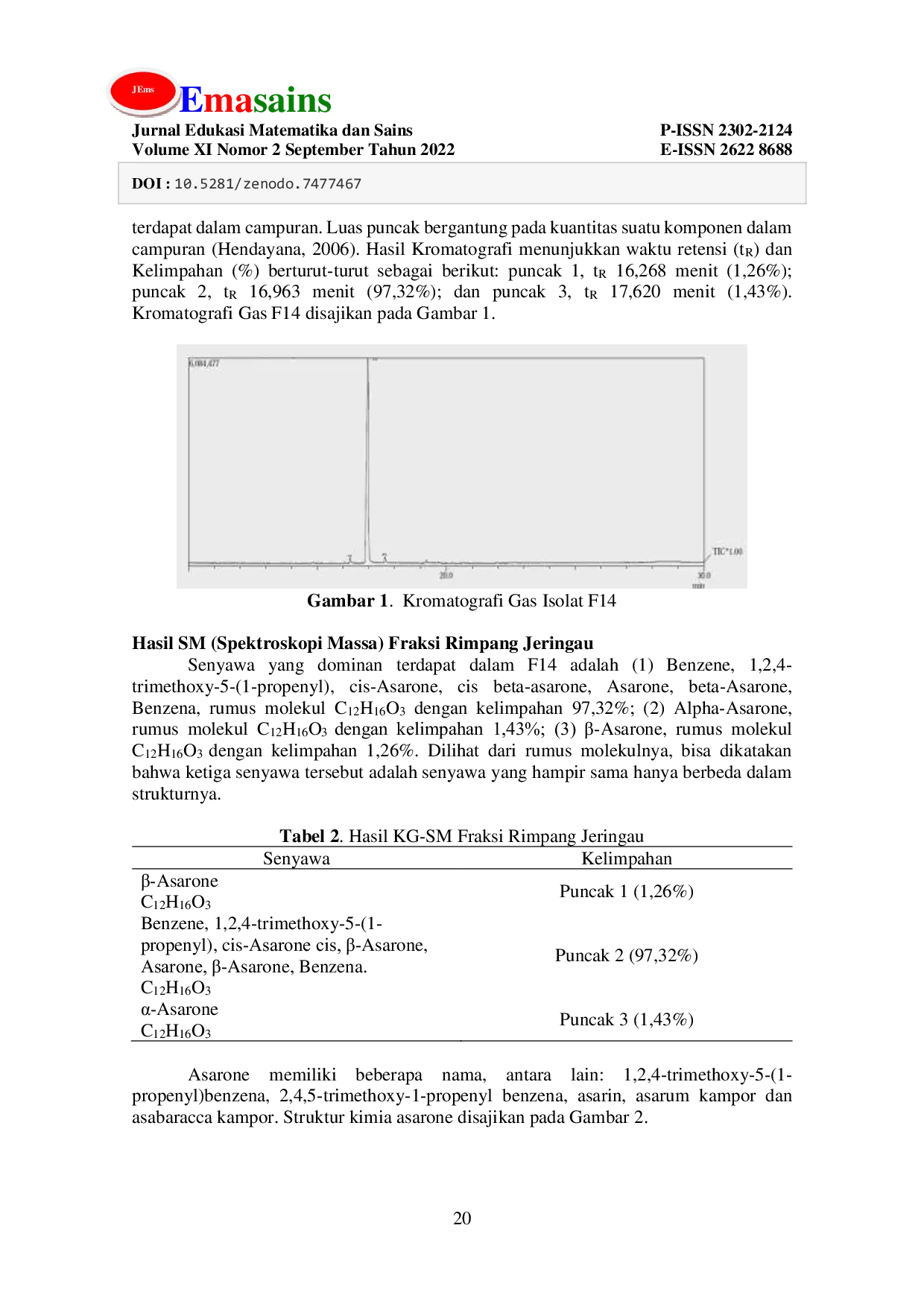 Emasains : Jurnal Edukasi Matematika dan SainsEmasains : Jurnal Edukasi Matematika dan SainsPenelitian ini bertujuan untuk mengetahui fraksi komponen aktif pada ekstrak kasar rimpang jeringau, yang mampu menghambat pertumbuhan jamur Sclerotium rolfsii penyebab penyakit busuk batang pada kacang tanah. Pengendalian yang dilakukan selama ini dengan pestisida sintetis berdampak negatif terhadap lingkungan maupun manusia. Hal ini tentu membutuhkan alternatif pengendalian lain yang lebih ramah lingkungan. Pestisida nabati bisa menjadi salah satu alternatif. Jeringau (Acorus calamus) bisa dimanfaatkan sebagai pestisida nabati. Rimpang jeringau menurut Shenvi et al., (2011), mampu menghambat jamur Phytophthora capsici penyebab penyakit busuk pangkal batang pada tanaman lada. Pengujian fraksinasi dilakukan untuk mengetahui senyawa yang diduga bersifat antijamur. Hasil analisa menunjukkan ekstrak rimpang jeringau mengandung Triterpenoid/Steroid, Flavonoid, Alkaloid, Fenolat, dan Tannin. Hasil analisis KG-SM menunjukkan senyawa yang diduga bersifat antijamur terhadap S. rolfsii adalah Asarone. Dari hasil penelitian dapat disimpulkan bahwa ekstrak rimpang jeringau mampu menghambat S. rolfsii dengan sangat kuat. Hasil penelitian ini diharapkan dapat dipakai sebagai dasar untuk penerapan rimpang jeringau di lapangan.