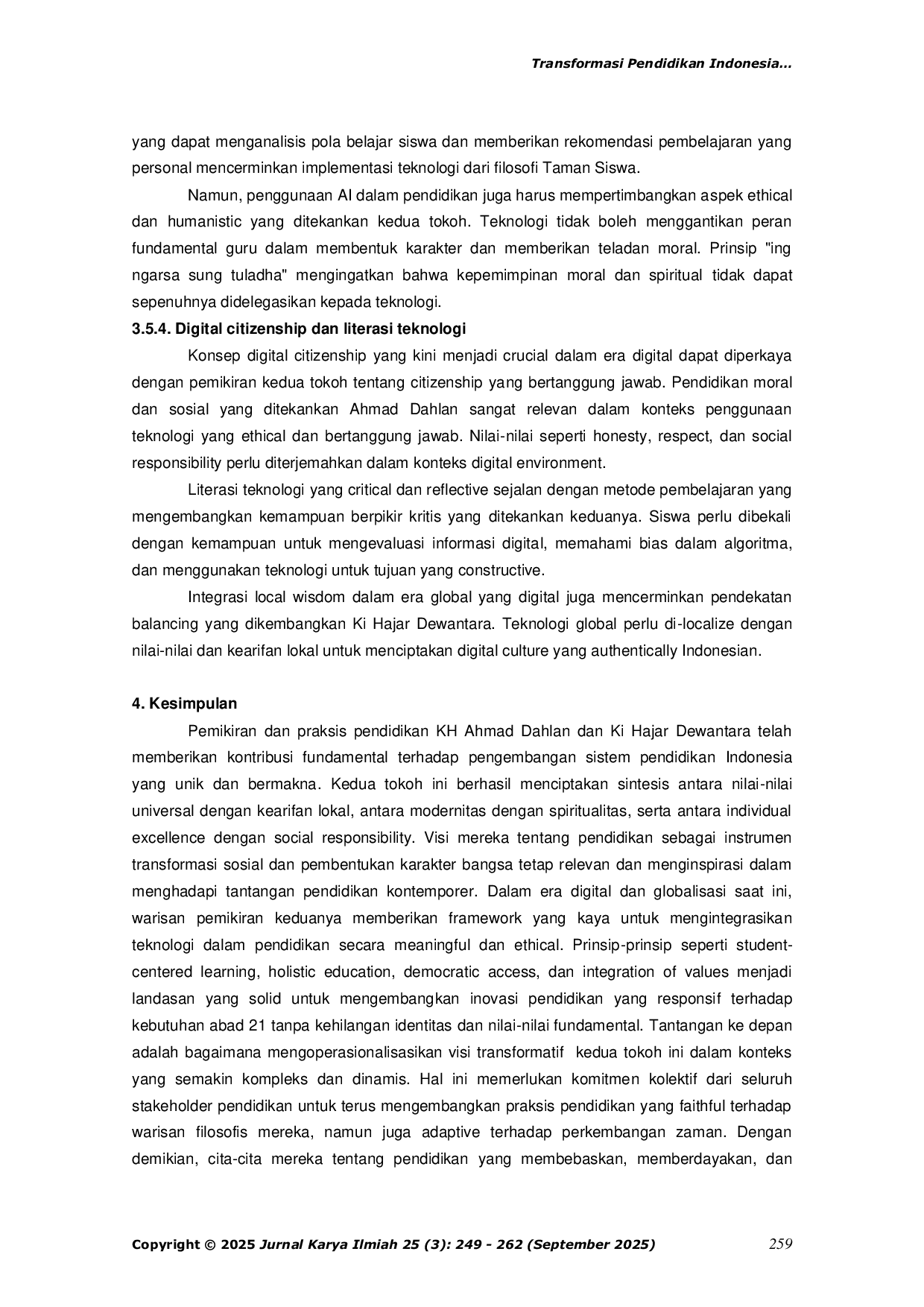 Jurnal Kajian IlmiahJurnal Kajian IlmiahPenelitian ini bertujuan untuk mengeksplorasi dan menyintesiskan pemikiran serta praksis pendidikan KH Ahmad Dahlan dan Ki Hajar Dewantara sebagai dasar konseptual transformasi pendidikan Indonesia di era digital. Dengan menggunakan pendekatan kualitatif-filosofis melalui studi pustaka dan analisis hermeneutik, penelitian ini mengungkap nilai-nilai inti dari pendidikan berkemajuan berbasis iman, ilmu, dan amal menurut KH Ahmad Dahlan, serta pendidikan holistik dan humanis berlandaskan kebudayaan bangsa menurut Ki Hajar Dewantara. Hasil kajian menunjukkan bahwa sintesis pemikiran keduanya dapat memberikan arah baru bagi pembangunan sistem pendidikan yang memadukan nilai spiritual, karakter, dan teknologi secara seimbang. Sintesis ini relevan dalam menjawab tantangan kontemporer seperti digitalisasi, pembelajaran hibrida, kecerdasan buatan, hingga krisis identitas pendidikan nasional. Penelitian ini merekomendasikan model pendidikan yang berbasis nilai-nilai lokal dan universal, serta adaptif terhadap disrupsi digital, untuk membentuk manusia Indonesia yang merdeka, beriman, dan berdaya saing global.