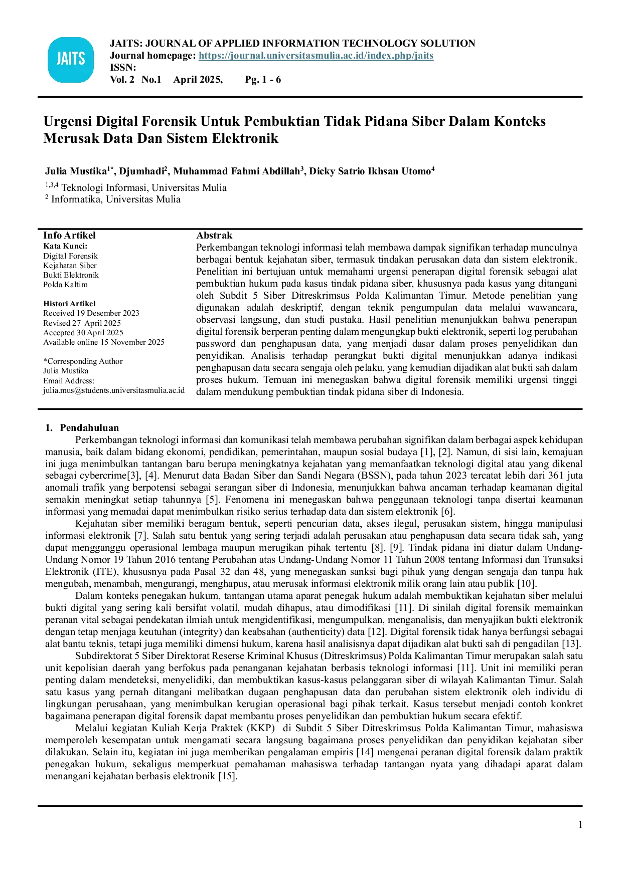 JAITS: JOURNAL OF APPLIED INFORMATION TECHNOLOGY SOLUTIONJAITS: JOURNAL OF APPLIED INFORMATION TECHNOLOGY SOLUTIONPerkembangan teknologi informasi telah membawa dampak signifikan terhadap munculnya berbagai bentuk kejahatan siber, termasuk tindakan perusakan data dan sistem elektronik. Penelitian ini bertujuan untuk memahami urgensi penerapan digital forensik sebagai alat pembuktian hukum pada kasus tindak pidana siber, khususnya pada kasus yang ditangani oleh Subdit 5 Siber Ditreskrimsus Polda Kalimantan Timur. Metode penelitian yang digunakan adalah deskriptif, dengan teknik pengumpulan data melalui wawancara, observasi langsung, dan studi pustaka. Hasil penelitian menunjukkan bahwa penerapan digital forensik berperan penting dalam mengungkap bukti elektronik, seperti log perubahan password dan penghapusan data, yang menjadi dasar dalam proses penyelidikan dan penyidikan. Analisis terhadap perangkat bukti digital menunjukkan adanya indikasi penghapusan data secara sengaja oleh pelaku, yang kemudian dijadikan alat bukti sah dalam proses hukum. Temuan ini menegaskan bahwa digital forensik memiliki urgensi tinggi dalam mendukung pembuktian tindak pidana siber di Indonesia.