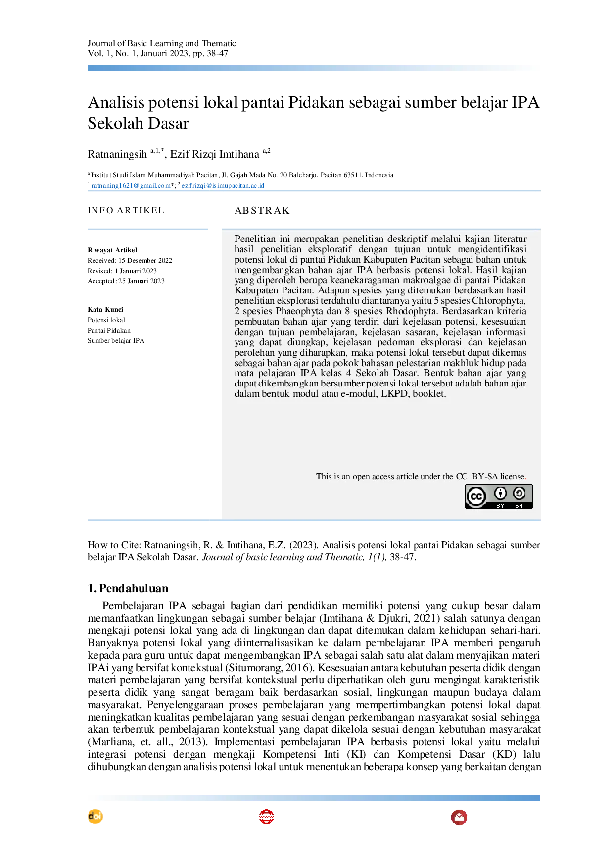 Journal of Basic Learning and ThematicJournal of Basic Learning and ThematicPenelitian ini merupakan penelitian deskriptif melalui kajian literatur hasil penelitian eksploratif dengan tujuan untuk mengidentifikasi potensi lokal di pantai Pidakan Kabupaten Pacitan sebagai bahan untuk mengembangkan bahan ajar IPA berbasis potensi lokal. Hasil kajian yang diperoleh berupa keanekaragaman makroalgae di pantai Pidakan Kabupaten Pacitan. Adapun spesies yang ditemukan berdasarkan hasil penelitian eksplorasi terdahulu diantaranya yaitu 5 spesies Chlorophyta, 2 spesies Phaeophyta dan 8 spesies Rhodophyta. Berdasarkan kriteria pembuatan bahan ajar yang terdiri dari kejelasan potensi, kesesuaian dengan tujuan pembelajaran, kejelasan sasaran, kejelasan informasi yang dapat diungkap, kejelasan pedoman eksplorasi dan kejelasan perolehan yang diharapkan, maka potensi lokal tersebut dapat dikemas sebagai bahan ajar pada pokok bahasan pelestarian makhluk hidup pada mata pelajaran IPA kelas 4 Sekolah Dasar. Bentuk bahan ajar yang dapat dikembangkan bersumber potensi lokal tersebut adalah bahan ajar dalam bentuk modul atau e-modul, LKPD, booklet.