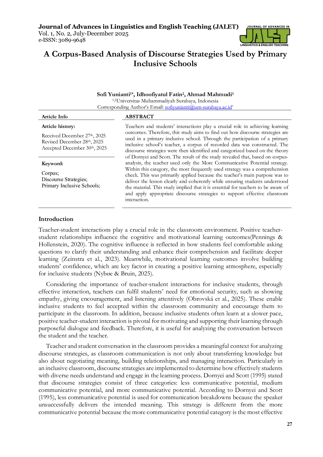 Journal of Advances in Linguistics and English Teaching (JALET)Journal of Advances in Linguistics and English Teaching (JALET)Interaksi antara guru dan siswa memiliki peran penting dalam mencapai hasil pembelajaran. Oleh karena itu, penelitian ini bertujuan untuk mengetahui bagaimana strategi diskursus digunakan di sekolah inklusif tingkat dasar. Melalui partisipasi seorang guru sekolah inklusif tingkat dasar, kumpulan data yang direkam dibangun. Strategi diskursus kemudian diidentifikasi dan dikategorikan berdasarkan teori Dornyei dan Scott. Hasil studi menunjukkan bahwa, berdasarkan analisis korpora, guru hanya menggunakan strategi Potensi Komunikatif Lebih Tinggi. Dalam kategori ini, strategi yang paling sering digunakan adalah pemeriksaan pemahaman. Ini terutama diterapkan karena tujuan utama guru adalah menyampaikan pelajaran secara jelas dan koheren sambil memastikan siswa memahami materi. Studi ini mengimplikasikan bahwa penting bagi guru untuk menyadari dan menerapkan strategi diskursus yang tepat untuk mendukung interaksi kelas yang efektif.
