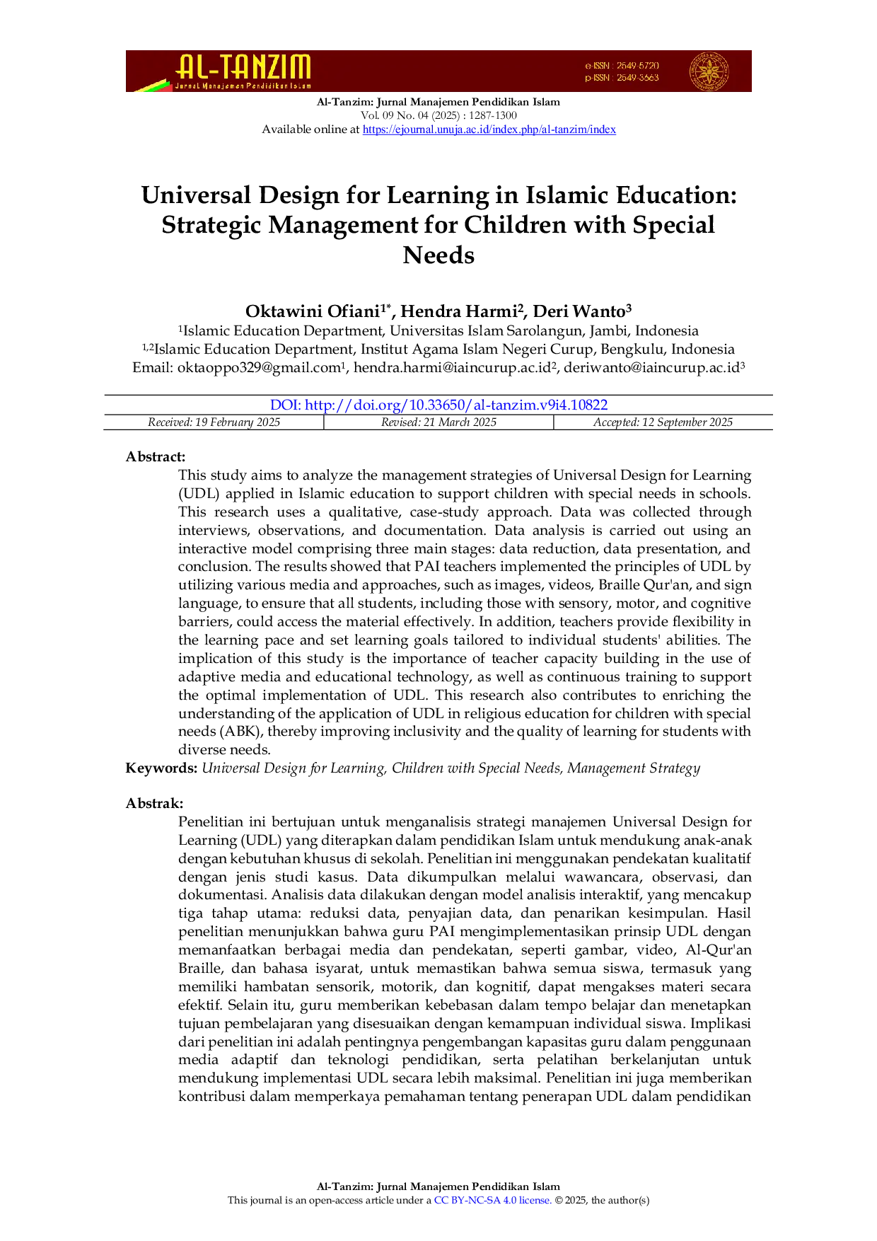 Al-Tanzim: Jurnal Manajemen Pendidikan IslamAl-Tanzim: Jurnal Manajemen Pendidikan IslamThis study aims to analyze the management strategies of Universal Design for Learning (UDL) applied in Islamic education to support children with special needs in schools. This research uses a qualitative, case-study approach. Data was collected through interviews, observations, and documentation. Data analysis is carried out using an interactive model comprising three main stages: data reduction, data presentation, and conclusion. The results showed that PAI teachers implemented the principles of UDL by utilizing various media and approaches, such as images, videos, Braille Quran, and sign language, to ensure that all students, including those with sensory, motor, and cognitive barriers, could access the material effectively. In addition, teachers provide flexibility in the learning pace and set learning goals tailored to individual students abilities. The implication of this study is the importance of teacher capacity building in the use of adaptive media and educational technology, as well as continuous training to support the optimal implementation of UDL. This research also contributes to enriching the understanding of the application of UDL in religious education for children with special needs (ABK), thereby improving inclusivity and the quality of learning for students with diverse needs.