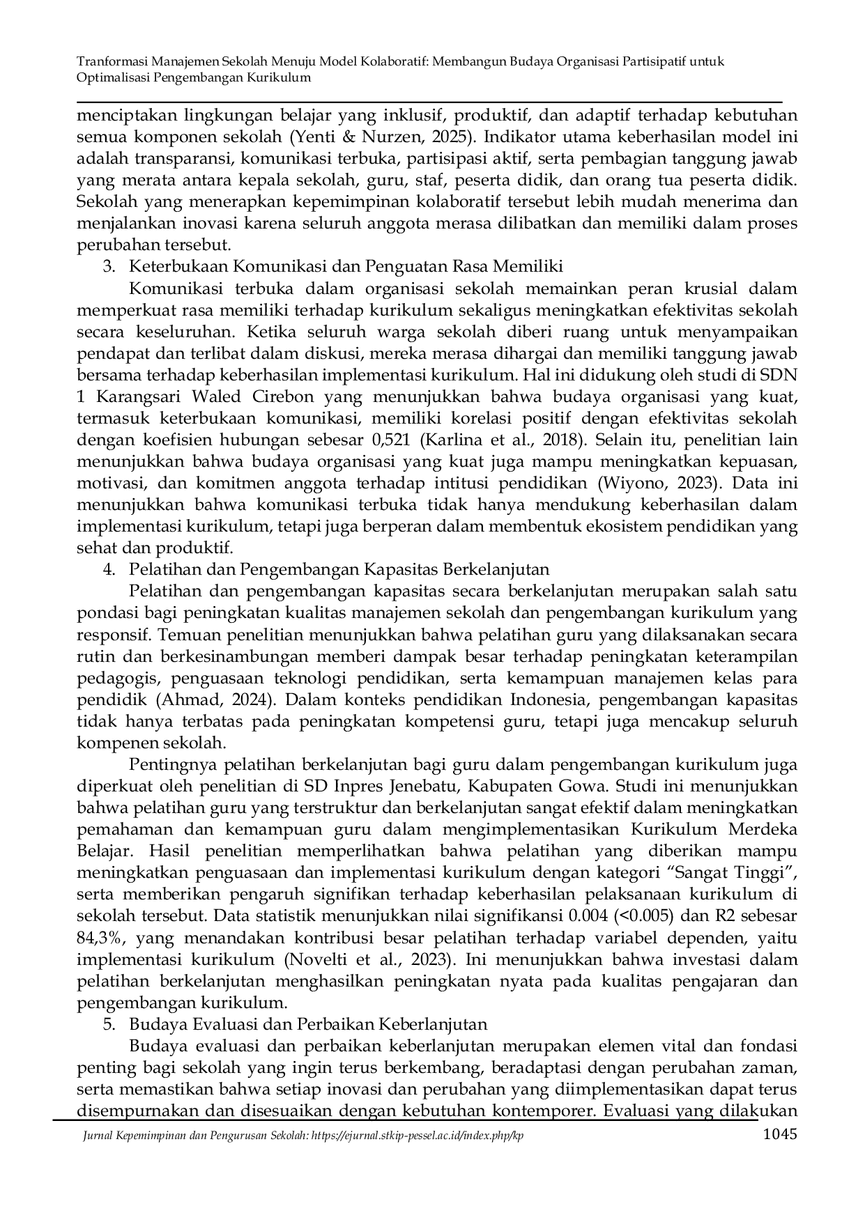 Transformasi budaya organisasi sekolah menuju pola partisipatif dan kolaboratif merupakan kunci utama dalam pengembangan kurikulum yang relevan, responsif, dan adaptif terhadap kebutuhan peserta didik serta dinamika lingkungan sekolah.Keterbukaan komunikasi dan penguatan rasa memiliki terbukti memperkuat partisipasi aktif seluruh warga sekolah, sehingga tercipta ekosistem pendidikan yang sehat, inovatif, dan produktif.Pelatihan dan pengembangan kapasitas berkelanjutan bagi guru dan tenaga kependidikan menjadi fondasi penting dalam meningkatkan kualitas manajemen sekolah serta kesiapan menghadapi perubahan kurikulum dan teknologi pendidikan.Selain itu, budaya evaluasi dan perbaikan berkelanjutan yang terintegrasi dalam tata kelola sekolah mendorong terciptanya siklus perbaikan yang adaptif dan inovatif, serta memastikan setiap kebijakan dan program pendidikan selalu relevan dengan kebutuhan kontemporer.