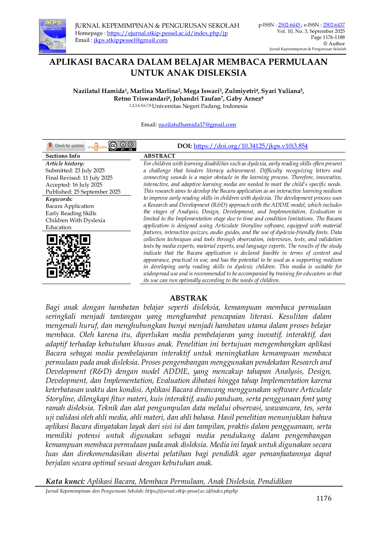 Jurnal Kepemimpinan dan Pengurusan SekolahJurnal Kepemimpinan dan Pengurusan SekolahFor children with learning disabilities such as dyslexia, early reading skills often present a challenge that hinders literacy achievement. Difficulty recognizing letters and connecting sounds is a major obstacle in the learning process. Therefore, innovative, interactive, and adaptive learning media are needed to meet the childs specific needs. This research aims to develop the Bacara application as an interactive learning medium to improve early reading skills in children with dyslexia. The development process uses a Research and Development (R&D) approach with the ADDIE model, which includes the stages of Analysis, Design, Development, and Implementation. Evaluation is limited to the Implementation stage due to time and condition limitations. The Bacara application is designed using Articulate Storyline software, equipped with material features, interactive quizzes, audio guides, and the use of dyslexia-friendly fonts. Data collection techniques and tools through observation, interviews, tests, and validation tests by media experts, material experts, and language experts. The results of the study indicate that the Bacara application is declared feasible in terms of content and appearance, practical in use, and has the potential to be used as a supporting medium in developing early reading skills in dyslexic children. This media is suitable for widespread use and is recommended to be accompanied by training for educators so that its use can run optimally according to the needs of children.