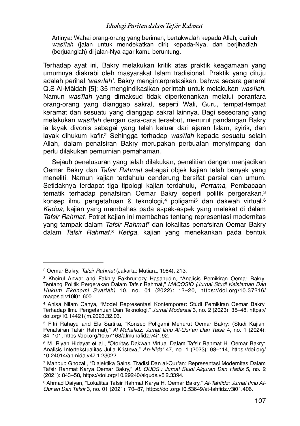 Penelitian ini menemukan bahwa penafsiran Oemar Bakry dalam Tafsir Rahmat mengandung kecenderungan ideologi puritan yang terdistribusi pada sejumlah tema sentral, terutama terkait konsep wasīlah, syafāat, dan ziarah kubur.Kecenderungan tersebut tidak muncul secara sporadis, melainkan dibentuk oleh konstruksi pemahaman tertentu yang dapat ditelusuri melalui pendekatan hermeneutika Hans-Georg Gadamer.Pertama, pra-pemahaman Bakry yang dipengaruhi oleh ideologi kaum pembaharu membentuk horizon berpikir yang bercorak purifikatif.Kedua, pra-pemahaman terhadap konsep syafāat, kafir, dan syirik turut menentukan batasan normatif dalam mengidentifikasi praktik keagamaan, sehingga sejumlah tradisi seperti tawassul kepada wali atau praktik ziarah tertentu dikategorikan berpotensi mengarah pada kesyirikan.Ketiga, penggunaan pendekatan tekstualis memperkuat orientasi tersebut, karena penekanan pada aspek literal teks membatasi eksplorasi terhadap dimensi universal dan kontekstual pesan Al-Quran.