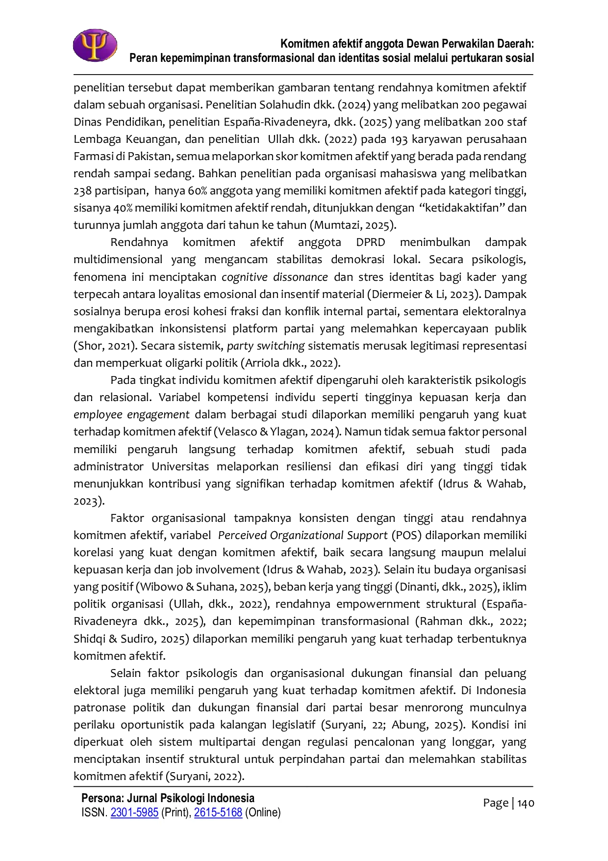 Persona:Jurnal Psikologi IndonesiaPersona:Jurnal Psikologi IndonesiaFenomena kutu loncat anggota Dewan Perwakilan Rakyat Daerah (DPRD) di Jawa Timur mengindikasikan rendahnya komitmen afektif terhadap partai politik, yang pada gilirannya akan mengancam stabilitas demokrasi lokal. Penelitian ini menguji pengaruh kepemimpinan transformasional dan identitas sosial terhadap komitmen afektif anggota DPRD, melalui pertukaran sosial sebagai variabel mediasi. Menggunakan desain kuantitatif dengan Structural Equation Modeling (SEM), penelitian melibatkan 287 anggota DPRD aktif di kota atau kabupaten di Jawa Timur dari 5 Badan Koordinasi Wilayah (Bakorwil). Instrumen penelitian terdiri dari Affective Commitment Scale (α=0,85), MLQ Transformational Leadership (α=0,92), Three‑Factor Social Identity (α=0,88), dan Amalgamated Social Exchange (α=0,90). Hasil penelitian menunjukkan identitas sosial memiliki pengaruh terkuat terhadap komitmen afektif, diikuti kepemimpinan transformasional, sementara pertukaran sosial terbukti dapat memediasi secara parsial. Temuan ini menegaskan identitas sosial sebagai prediktor utama komitmen dalam konteks politik kolektivis Indonesia.