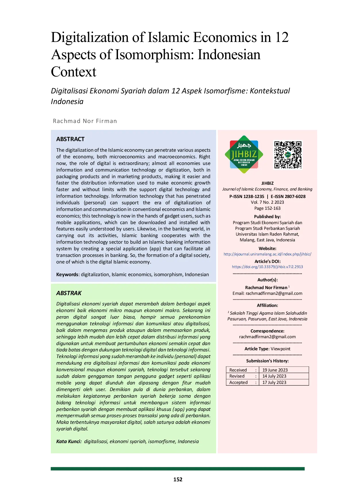 Jihbiz : Jurnal Ekonomi, Keuangan dan Perbankan SyariahJihbiz : Jurnal Ekonomi, Keuangan dan Perbankan SyariahDigitalisasi ekonomi syariah dapat merambah dalam berbagai aspek ekonomi baik ekonomi mikro maupun ekonomi makro. Sekarang ini peran digital sangat luar biasa, hampir semua perekonomian menggunakan teknologi informasi dan komunikasi atau digitalisasi, baik dalam mengemas produk ataupun dalam memasarkan produk, sehingga lebih mudah dan lebih cepat dalam distribusi informasi yang digunakan untuk membuat pertumbuhan ekonomi semakin cepat dan tiada batas dengan dukungan teknologi digital dan teknologi informasi. Teknologi informasi yang sudah merambah ke individu (personal) dapat mendukung era digitalisasi informasi dan komunikasi pada ekonomi konvensional maupun ekonomi syariah, teknologi tersebut sekarang sudah dalam genggaman tangan pengguna gadget seperti aplikasi mobile yang dapat diunduh dan dipasang dengan fitur mudah dimengerti oleh user. Demikian pula di dunia perbankan, dalam melakukan kegiatannya perbankan syariah bekerja sama dengan bidang teknologi informasi untuk membangun sistem perbankan syariah dengan membuat aplikasi khusus (app) yang dapat mempermudah semua proses-proses transaksi yang ada di perbankan. Maka terbentuknya masyarakat digital, salah satunya adalah ekonomi syariah digital.