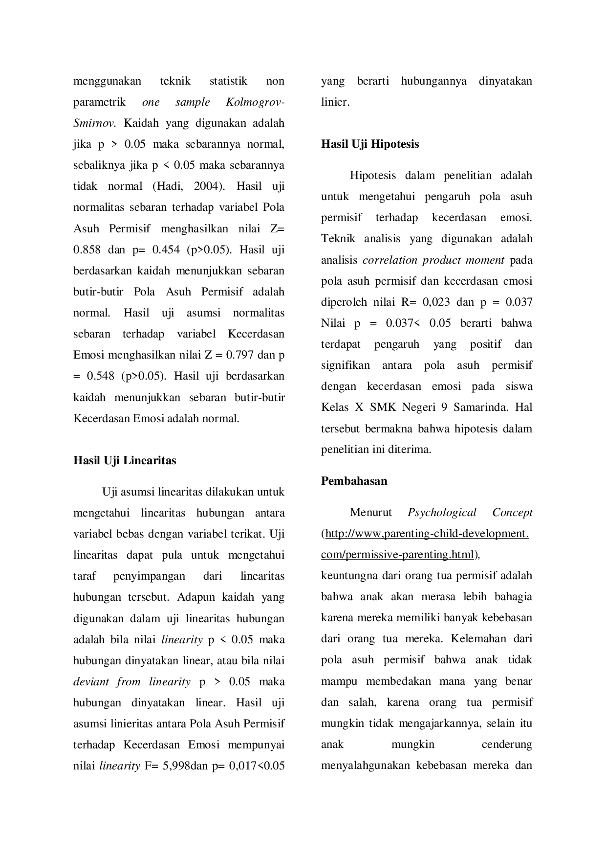 Berdasarkan hasil analisa correlation product moment pada pola asuh permisif dan kecerdasan emosi, diperoleh nilai R2 = 0,023 dan p = 0,037.Dimana nilai p = 0,037 < 0,05 berarti bahwa terdapat pengaruh yang positif dan signifikan antara pola asuh permisif dengan kecerdasan emosi pada siswa Kelas X SMK Negeri 9 Samarinda.Berdasarkan hasil uji hipotesis yang dilakukan, didapatkan nilai R2 = 0.023, yang berarti bahwa didapatkan sumbangan efektif variabel Pola Asuh Permisif terhadap Kecerdasan Emosi sebesar 2,3% dan sisanya sebesar 97,7% terdapat pada variabel lain yang mempengaruhi kecerdasan emosi.
