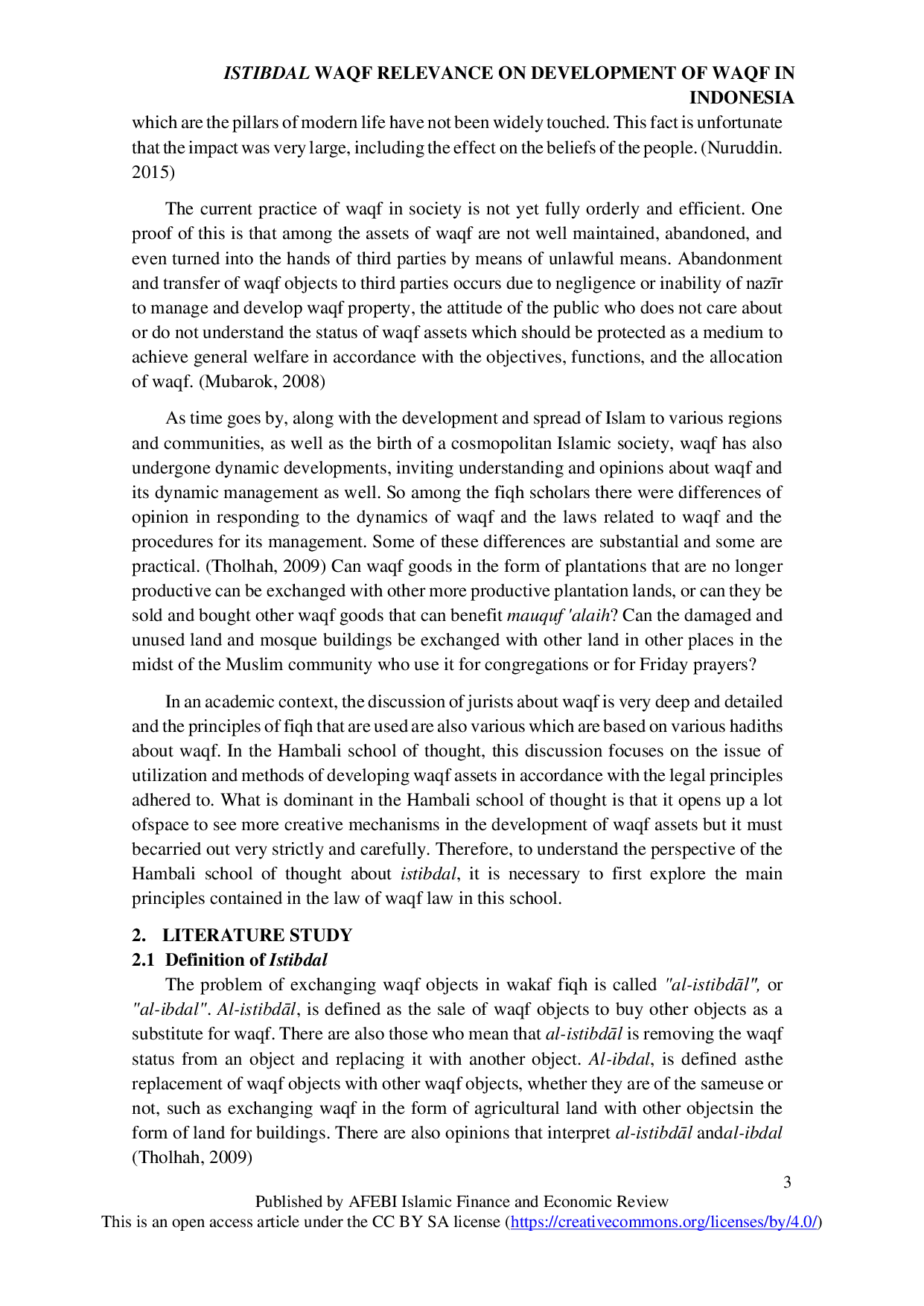 AFEBI Islamic Finance and Economic ReviewAFEBI Islamic Finance and Economic ReviewPenelitian ini bertujuan untuk menggambarkan perspektif mazhab Hambali terhadap istibdal wakaf, di mana terdapat banyak pendapat di antara para ulama mengenai kemampuan pelaksanaan istibdal pada harta wakaf. Perbedaan pendapat para ulama fiqh dalam menanggapi dinamika wakaf, peraturan terkait wakaf, dan prosedur pengelolaannya penting untuk dibahas karena dapat berdampak pada perumusan kebijakan di masa mendatang. Penelitian ini juga membahas relevansi istibdal wakaf terhadap pengembangan wakaf di Indonesia dari perspektif mazhab Hambali. Penelitian ini menggunakan pendekatan deskriptif‑kualitatif dengan metode penelitian kepustakaan. Hasil penelitian menunjukkan bahwa istibdal wakaf diperbolehkan dalam perspektif mazhab Hambali dan sangat relevan bagi pengembangan wakaf di Indonesia.