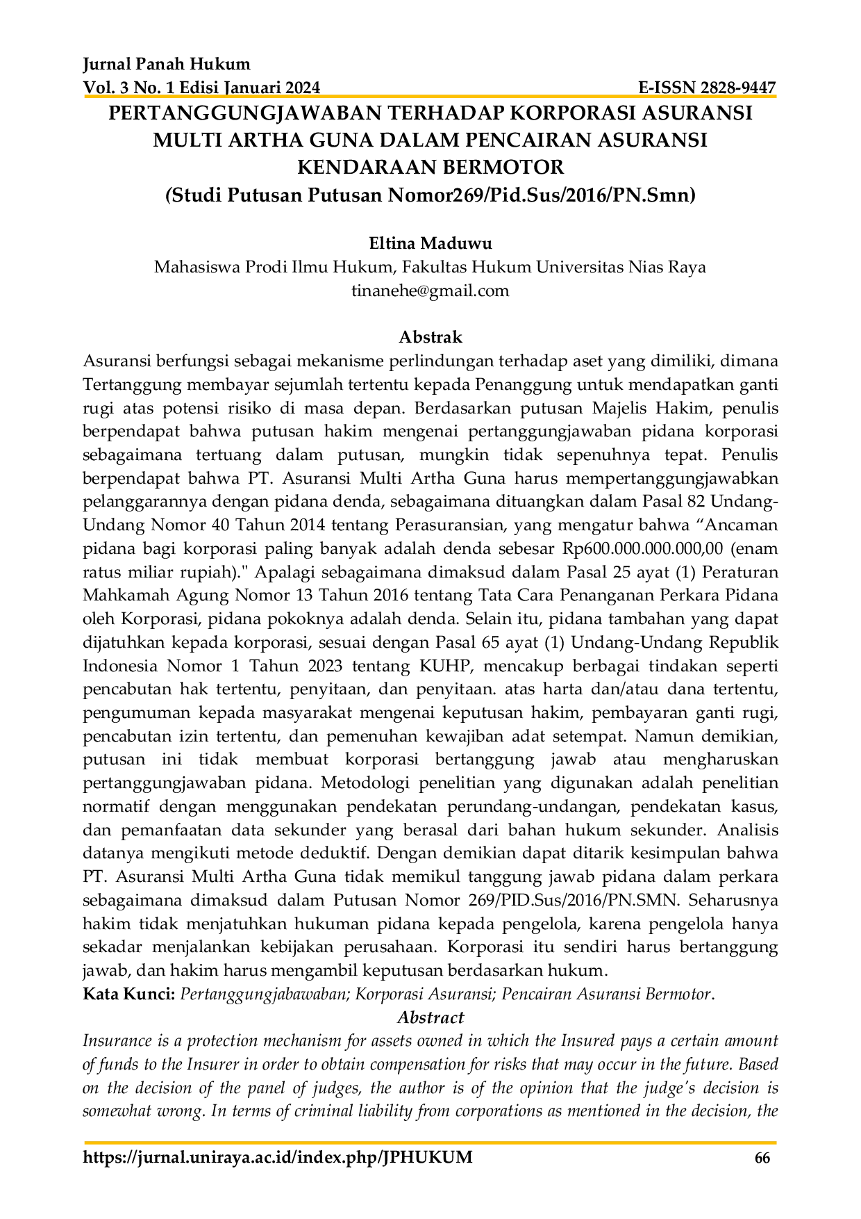 Jurnal Panah HukumJurnal Panah HukumAsuransi berfungsi sebagai mekanisme perlindungan terhadap aset yang dimiliki, dimana Tertanggung membayar sejumlah tertentu kepada Penanggung untuk mendapatkan ganti rugi atas potensi risiko di masa depan. Berdasarkan putusan Majelis Hakim, penulis berpendapat bahwa putusan hakim mengenai pertanggungjawaban pidana korporasi sebagaimana tertuang dalam putusan, mungkin tidak sepenuhnya tepat. Penulis berpendapat bahwa PT. Asuransi Multi Artha Guna harus mempertanggungjawabkan pelanggarannya dengan pidana denda, sebagaimana dituangkan dalam Pasal 82 Undang-Undang Nomor 40 Tahun 2014 tentang Perasuransian, yang mengatur bahwa Ancaman pidana bagi korporasi paling banyak adalah denda sebesar Rp600.000.000.000,00 (enam ratus miliar rupiah)..