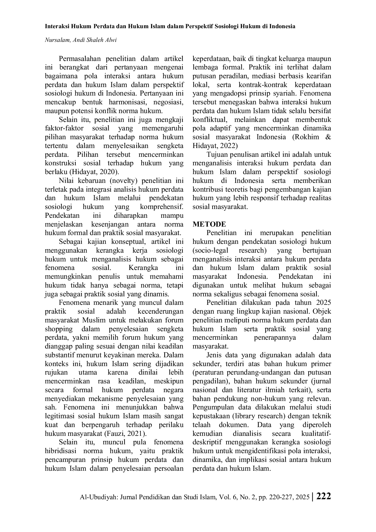 Al-Ubudiyah: Jurnal Pendidikan dan Studi IslamAl-Ubudiyah: Jurnal Pendidikan dan Studi IslamPenelitian ini bertujuan untuk menganalisis interaksi antara hukum perdata dan hukum Islam dalam perspektif sosiologi hukum di Indonesia serta menjelaskan implikasinya terhadap efektivitas penerapan hukum dalam masyarakat. Manfaat penelitian ini adalah memberikan pemahaman konseptual dan praktis mengenai relasi kedua sistem hukum tersebut sebagai dasar pengembangan hukum nasional yang lebih responsif terhadap realitas sosial. Metodologi penelitian yang digunakan adalah penelitian hukum normatif-sosiologis dengan pendekatan sosiologi hukum. Data diperoleh melalui studi kepustakaan terhadap peraturan perundang-undangan, putusan pengadilan, serta artikel jurnal nasional yang relevan dalam tujuh tahun terakhir. Analisis data dilakukan secara kualitatif-deskriptif dengan menempatkan hukum sebagai fenomena sosial yang dipengaruhi oleh nilai, budaya, dan kesadaran hukum masyarakat.
