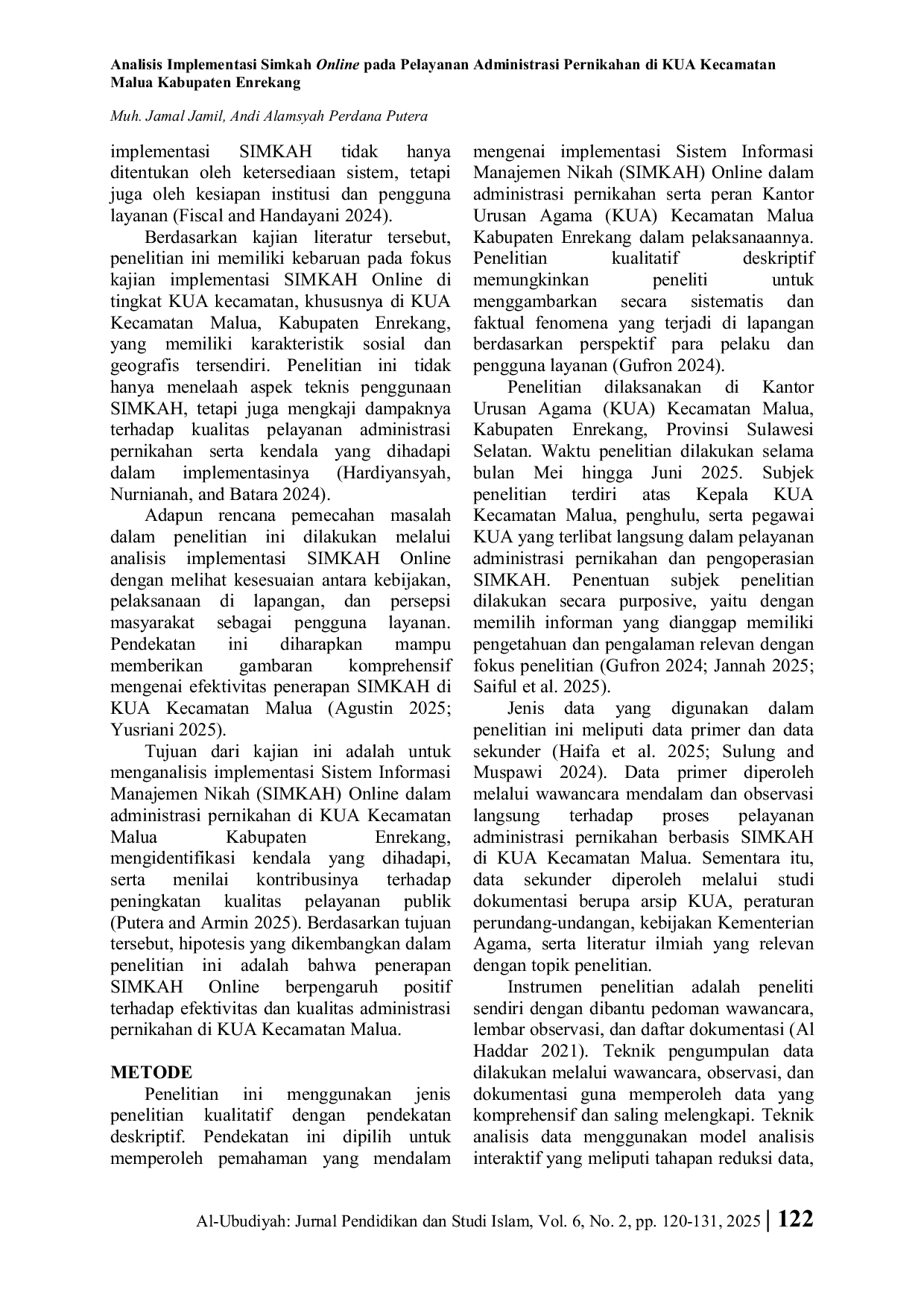 Al-Ubudiyah: Jurnal Pendidikan dan Studi IslamAl-Ubudiyah: Jurnal Pendidikan dan Studi IslamPenelitian ini bertujuan untuk menganalisis implementasi Sistem Informasi Manajemen Nikah (SIMKAH) Online dalam administrasi pernikahan di Kantor Urusan Agama (KUA) Kecamatan Malua Kabupaten Enrekang. Permasalahan penelitian difokuskan pada bagaimana peran KUA dalam mengimplementasikan SIMKAH serta faktor-faktor yang menghambat pelaksanaannya. Metode penelitian yang digunakan adalah metode kualitatif dengan pendekatan deskriptif, di mana data diperoleh melalui wawancara, observasi, dan dokumentasi. Hasil penelitian menunjukkan bahwa implementasi SIMKAH di KUA Kecamatan Malua pada dasarnya telah berjalan dan cukup efektif dalam meningkatkan tertib administrasi pernikahan serta kualitas pelayanan publik. SIMKAH memberikan kemudahan dalam proses pendaftaran, pencatatan, pengelolaan, dan penyimpanan data pernikahan dibandingkan sistem manual. Namun demikian, pelaksanaan SIMKAH masih menghadapi beberapa kendala, antara lain keterbatasan sarana dan prasarana, kurangnya sumber daya manusia yang menguasai teknologi informasi, minimnya sosialisasi kepada masyarakat, serta kendala teknis berupa ketidakstabilan jaringan internet dan gangguan sistem dari server pusat. Berdasarkan temuan tersebut, dapat disimpulkan bahwa implementasi SIMKAH di KUA Kecamatan Malua telah memberikan dampak positif, tetapi masih memerlukan penguatan dari aspek infrastruktur, peningkatan kapasitas sumber daya manusia, serta dukungan dan kesadaran masyarakat agar pelayanan administrasi pernikahan berbasis teknologi informasi dapat berjalan secara optimal dan berkelanjutan.