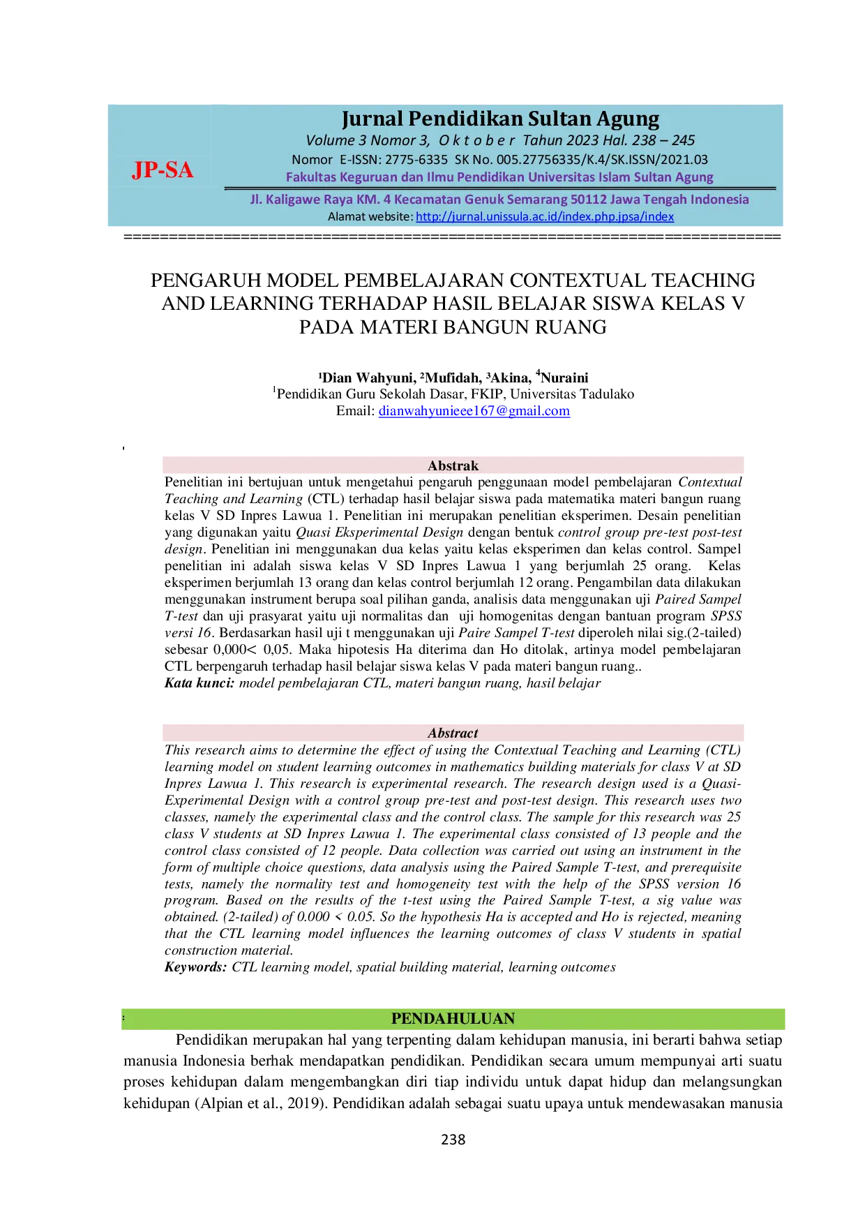 Jurnal Pendidikan Sultan AgungJurnal Pendidikan Sultan AgungPenelitian ini bertujuan untuk mengetahui pengaruh penggunaan model pembelajaran Contextual Teaching and Learning (CTL) terhadap hasil belajar siswa pada matematika materi bangun ruang kelas V SD Inpres Lawua 1. Penelitian ini merupakan penelitian eksperimen dengan desain Quasi Eksperimental Design dengan bentuk control group pre-test post-test design. Sampel penelitian adalah siswa kelas V SD Inpres Lawua 1 yang berjumlah 25 orang, terdiri dari 13 siswa kelas eksperimen dan 12 siswa kelas kontrol. Pengambilan data menggunakan soal pilihan ganda, analisis data menggunakan uji Paired Sampel T-test, uji normalitas, dan uji homogenitas dengan SPSS versi 16. Hasil penelitian menunjukkan bahwa model pembelajaran CTL berpengaruh terhadap hasil belajar siswa kelas V pada materi bangun ruang.