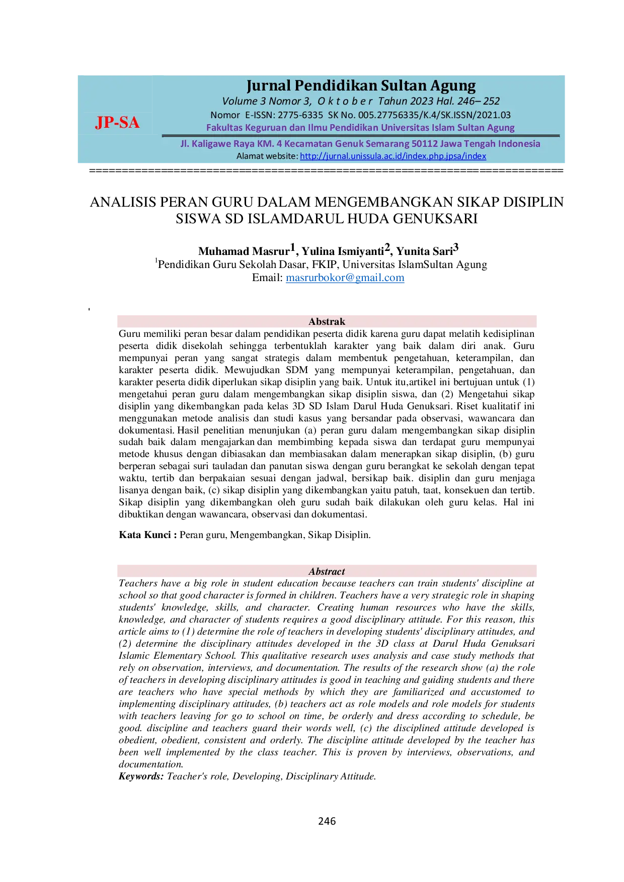 Jurnal Pendidikan Sultan AgungJurnal Pendidikan Sultan AgungGuru memiliki peran besar dalam pendidikan peserta didik karena guru dapat melatih kedisiplinan peserta didik di sekolah sehingga terbentuklah karakter yang baik dalam diri anak. Guru mempunyai peran yang sangat strategis dalam membentuk pengetahuan, keterampilan, dan karakter peserta didik. Mewujudkan SDM yang mempunyai keterampilan, pengetahuan, dan karakter peserta didik diperlukan sikap disiplin yang baik. Untuk itu, artikel ini bertujuan untuk (1) mengetahui peran guru dalam mengembangkan sikap disiplin siswa, dan (2) mengetahui sikap disiplin yang dikembangkan pada kelas 3D SD Islam Darul Huda Genuksari. Riset kualitatif ini menggunakan metode analisis dan studi kasus yang bersandar pada observasi, wawancara, dan dokumentasi. Hasil penelitian menunjukan (a) peran guru dalam mengembangkan sikap disiplin sudah baik dalam mengajarkan dan membimbing kepada siswa dan terdapat guru mempunyai metode khusus dengan dibiasakan dan membiasakan dalam menerapkan sikap disiplin, (b) guru berperan sebagai suri tauladan dan panutan siswa dengan guru berangkat ke sekolah dengan tepat waktu, tertib dan berpakaian sesuai dengan jadwal, bersikap baik. disiplin dan guru menjaga lisanya dengan baik, (c) sikap disiplin yang dikembangkan yaitu patuh, taat, konsekuen dan tertib. Sikap disiplin yang dikembangkan oleh guru sudah baik dilakukan oleh guru kelas. Hal ini dibuktikan dengan wawancara, observasi dan dokumentasi.
