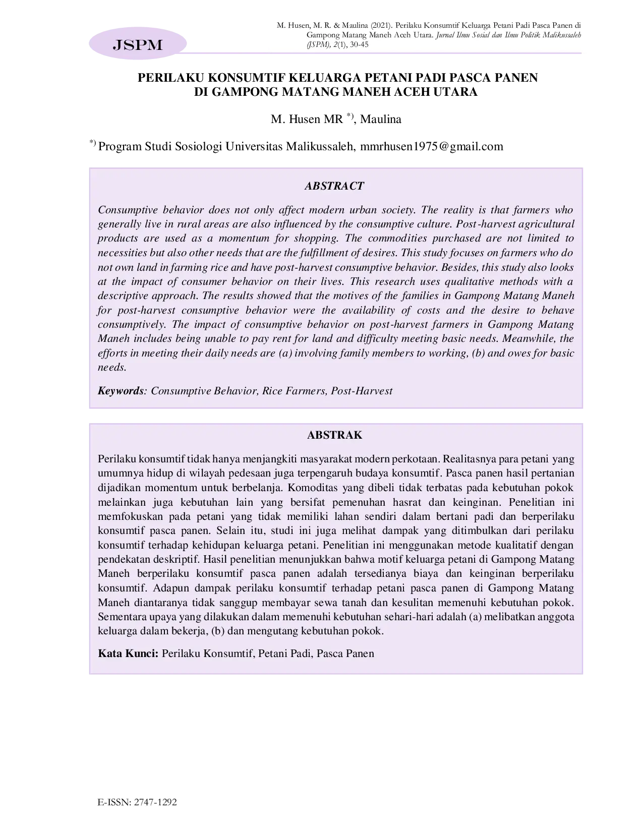 Jurnal Ilmu Sosial dan Ilmu Politik Malikussaleh (JSPM)Jurnal Ilmu Sosial dan Ilmu Politik Malikussaleh (JSPM)Perilaku konsumtif tidak hanya menjangkiti masyarakat modern perkotaan. Realitasnya para petani yang umumnya hidup di wilayah pedesaan juga terpengaruh budaya konsumtif. Pasca panen hasil pertanian dijadikan momentum untuk berbelanja. Komoditas yang dibeli tidak terbatas pada kebutuhan pokok melainkan juga kebutuhan lain yang bersifat pemenuhan hasrat dan keinginan. Penelitian ini memfokuskan pada petani yang tidak memiliki lahan sendiri dalam bertani padi dan berperilaku konsumtif pasca panen. Selain itu, studi ini juga melihat dampak yang ditimbulkan dari perilaku konsumtif terhadap kehidupan keluarga petani. Penelitian ini menggunakan metode kualitatif dengan pendekatan deskriptif. Hasil penelitian menunjukkan bahwa motif keluarga petani di Gampong Matang Maneh berperilaku konsumtif pasca panen adalah tersedianya biaya dan keinginan berperilaku konsumtif. Adapun dampak perilaku konsumtif terhadap petani pasca panen di Gampong Matang Maneh diantaranya tidak sanggup membayar sewa tanah dan kesulitan memenuhi kebutuhan pokok. Sementara upaya yang dilakukan dalam memenuhi kebutuhan sehari-hari adalah (a) melibatkan anggota keluarga dalam bekerja, (b) dan mengutang kebutuhan pokok.
