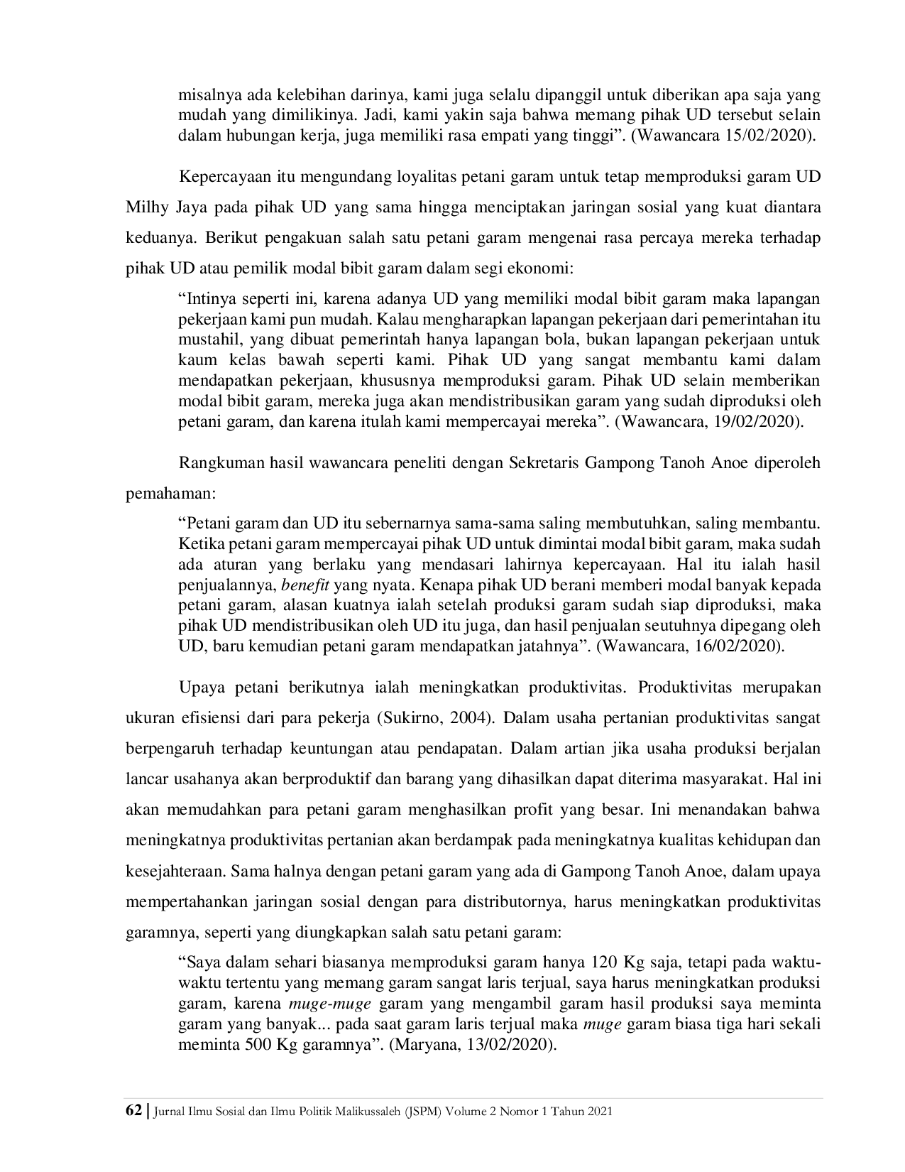 Jurnal Ilmu Sosial dan Ilmu Politik Malikussaleh (JSPM)Jurnal Ilmu Sosial dan Ilmu Politik Malikussaleh (JSPM)Penelitian ini dilakukan dengan tujuan agar dapat melihat bagaimana jaringan sosial petani garam dalam mendistribusikan hasil produksi garam dan upaya mempertahankan jaringan sosial yang sudah ada antara petani garam dengan distributornya. Teori yang menjadi landasan penelitian ini adalah teori Barry Wellman tentang jaringan sosial yang saling menghubungkan antar aktor. Pengumpulan data memakai metode observasi non-partisipan yaitu peneliti mengamati langsung bagaimana perilaku dari informan dan memperoleh pengalaman langsung sehingga memudahkan peneliti dalam melakukan analisis data. Analisis menggunakan metode kualitatif deskriptif yaitu dengan tujuan memberikan sebuah gambaran tentang masalah sosial melalui data berbentuk uraian kata-kata ataupun gambar. Dari hasil penelitian dapat disimpulkan bahwa bentuk jaringan petani garam ada dua yaitu jaringan dengan muge garam dan jaringan dengan UD Milhy Jaya. Adapun upaya mempertahankan jaringan sosial petani garam yaitu dengan kepercayaan, meningkatkan produktivitas, meningkatkan kualitas, dan penentuan harga.