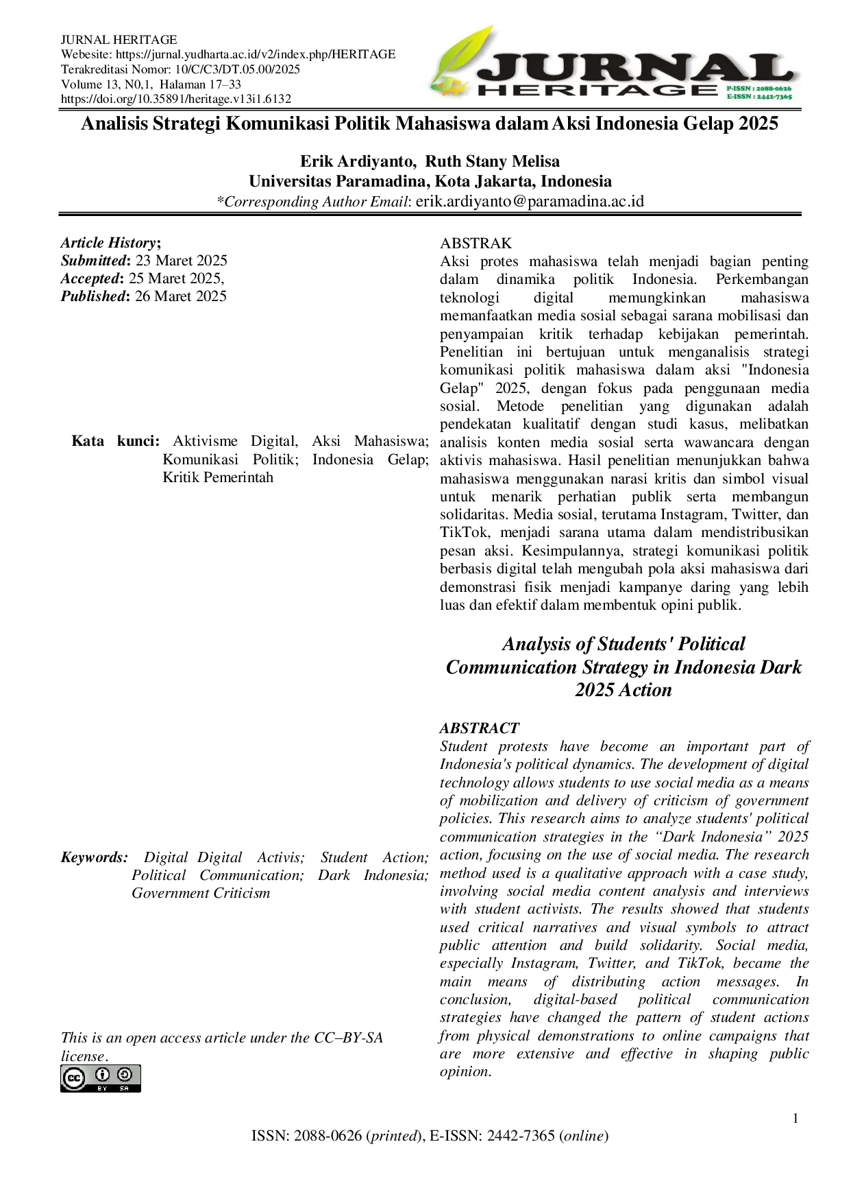 JURNAL HERITAGEJURNAL HERITAGEAksi protes mahasiswa telah menjadi bagian penting dalam dinamika politik Indonesia. Perkembangan teknologi memungkinkan mahasiswa memanfaatkan media sosial sebagai sarana mobilisasi dan penyampaian kritik terhadap kebijakan pemerintah. Penelitian ini bertujuan untuk menganalisis strategi komunikasi politik mahasiswa dalam aksi Indonesia Gelap 2025, dengan fokus pada penggunaan media sosial. Metode penelitian yang digunakan adalah pendekatan kualitatif dengan studi kasus, melibatkan analisis konten media sosial serta wawancara dengan aktivis mahasiswa. Hasil penelitian menunjukkan bahwa mahasiswa menggunakan narasi kritis dan simbol visual untuk menarik perhatian publik serta membangun solidaritas. Media sosial, terutama Instagram, Twitter, dan TikTok, menjadi sarana utama dalam mendistribusikan pesan aksi. Kesimpulannya, strategi komunikasi politik berbasis digital telah mengubah pola aksi mahasiswa dari demonstrasi fisik menjadi kampanye daring yang lebih luas dan efektif dalam membentuk opini publik.