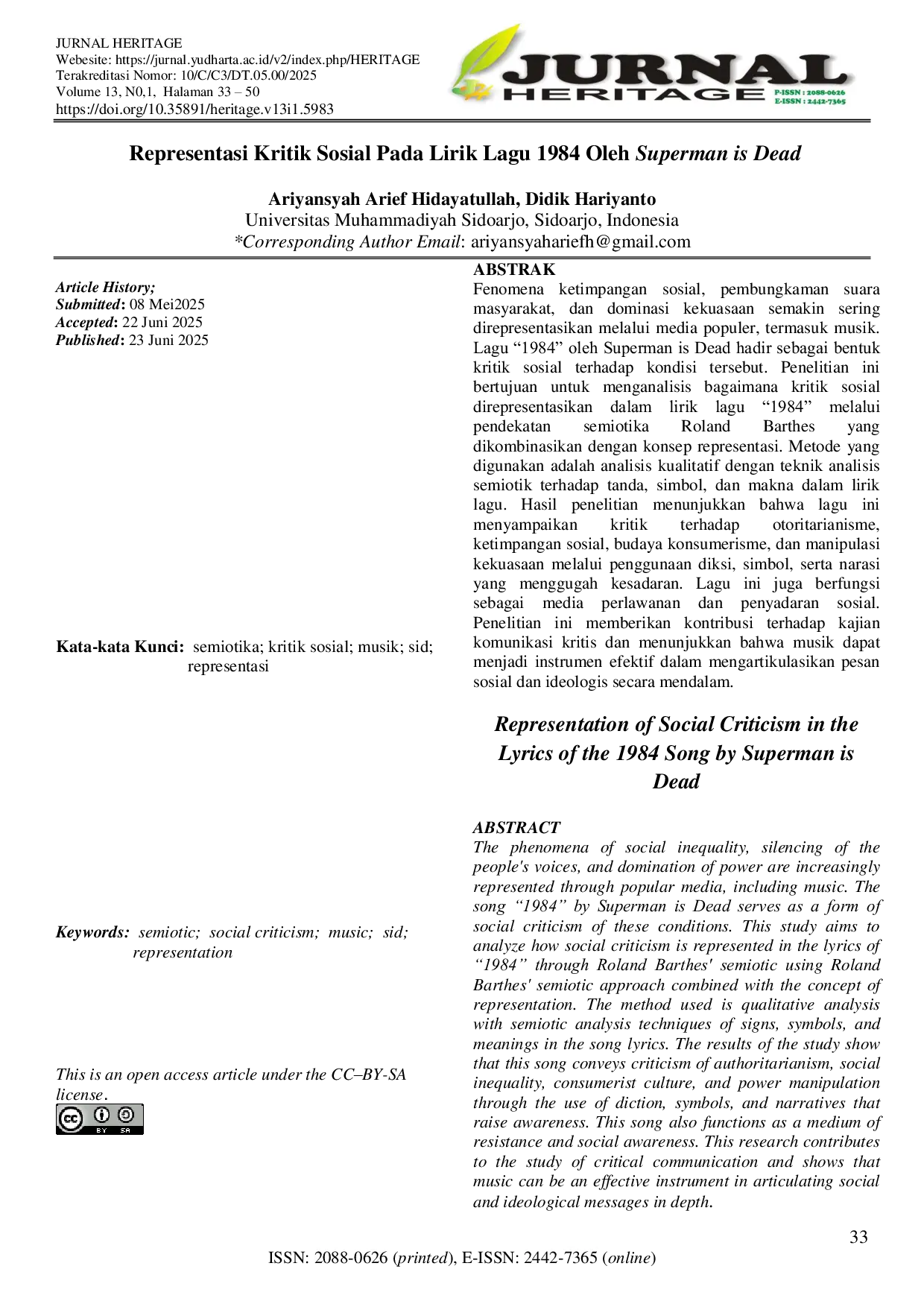 JURNAL HERITAGEJURNAL HERITAGEFenomena ketimpangan sosial, pembungkaman suara masyarakat, dan dominasi kekuasaan semakin sering direpresentasikan melalui media populer, termasuk musik. Lagu ―1984‖ oleh Superman is Dead hadir sebagai bentuk kritik sosial terhadap kondisi tersebut. Penelitian ini bertujuan untuk menganalisis bagaimana kritik sosial lagu ―1984‖ direpresentasikan dalam lirik yang menggunakan pendekatan semiotika dikombinasikan dengan konsep representasi. Metode yang digunakan adalah analisis kualitatif dengan teknik analisis semiotik terhadap tanda, simbol, dan makna dalam lirik lagu. Hasil penelitian menunjukkan bahwa lagu ini menyampaikan otoritarianisme, ketimpangan sosial, budaya konsumerisme, dan manipulasi kekuasaan melalui penggunaan diksi, simbol, serta narasi yang menggugah kesadaran. Lagu ini juga berfungsi sebagai media perlawanan dan penyadaran sosial. Penelitian ini memberikan kontribusi terhadap kajian komunikasi kritis dan menunjukkan bahwa musik dapat menjadi instrumen efektif dalam mengartikulasikan pesan sosial dan ideologis secara mendalam.